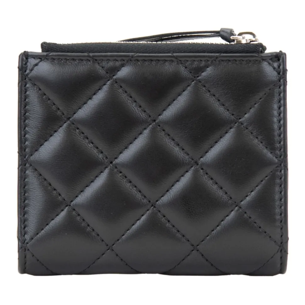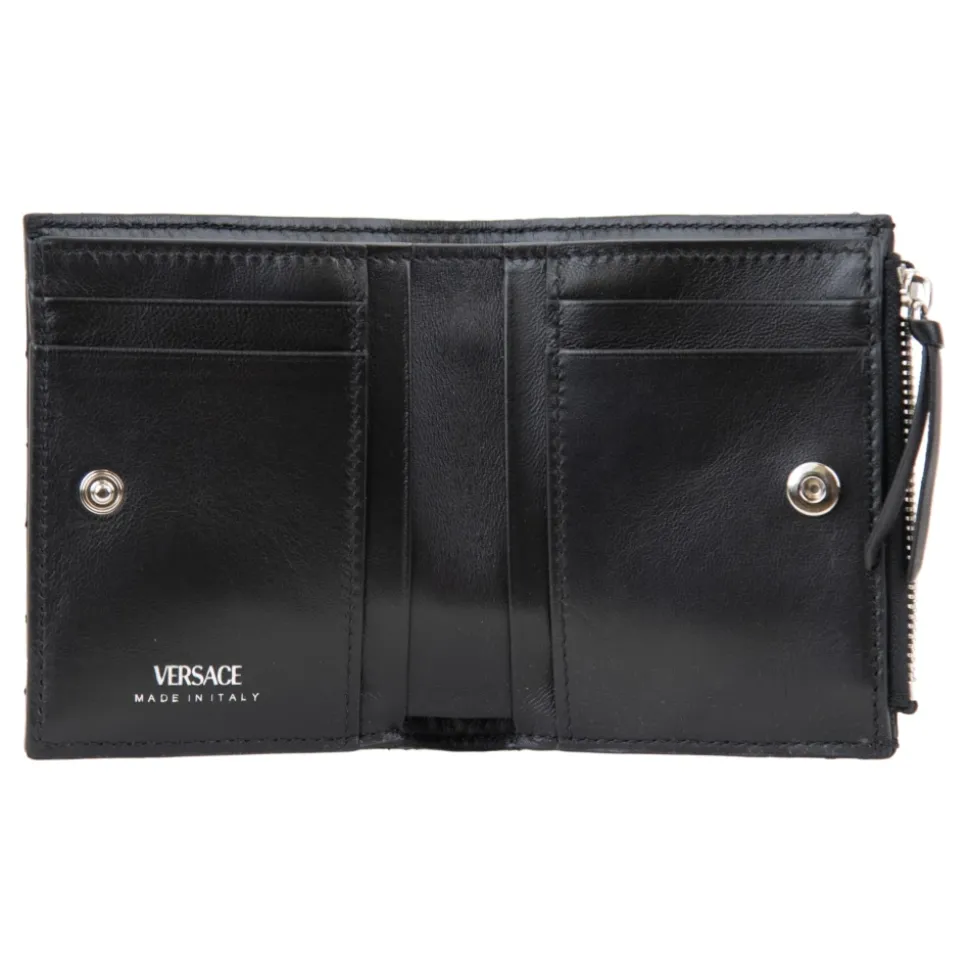 Forkæl dig selv med denne luksuriøse damepung fra Versace. Lavet af quiltet læder med et elegant sølvfarvet metallogo på forsiden. Produceret i Italien, denne pung har en møntlomme, kortlommer og lynlåslukning. Mål: B11cm x H9cm x D3cm.