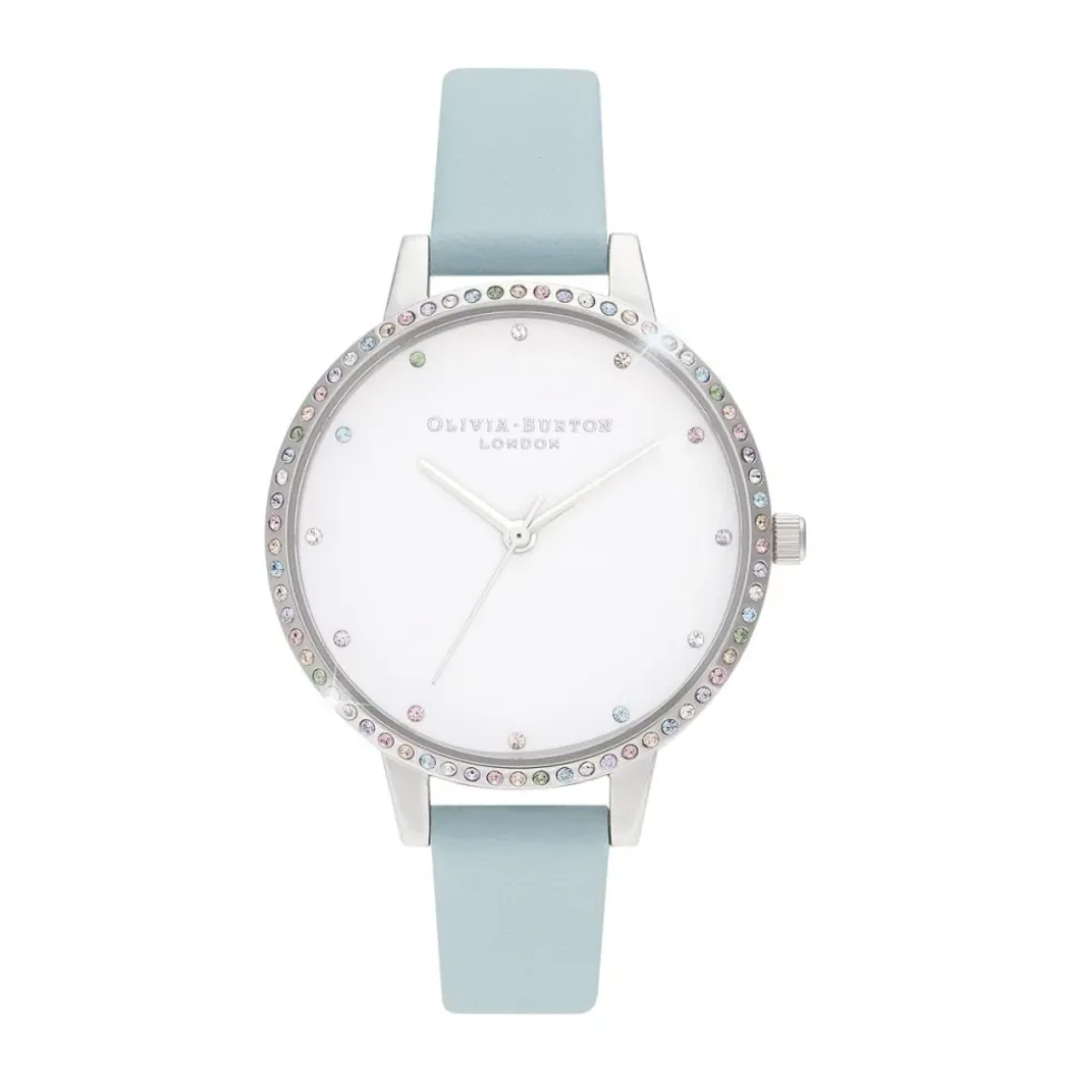Olivia Burton Rainbow Watch kombinerer en 34 mm urkasse i rustfrit stål med en blå rem i syntetisk læder og en urskive med rhinsten, der passer til hverdagsbrug. Det er et quartz analogt ur designet til et poleret, afslappet look. Vigtigste egenskaber: Blå | Sølv | Hvid | Rustfrit stål | Quartz urværk | Mineralglas | Vandafvisende til 1 ATM | Spænde | Analog visning | Rem i syntetisk læder | Timeindikatorer med rhinsten | Rund urskive | Hvid urskive | Dimensioner & pasform: Diameter urskive: 34 MM | | Sammensætning & pleje: Rustfrit stål | Syntetisk læder | Mineralglas | Tør af med en blød klud; undgå længerevarende udsættelse for vand og kemikalier.