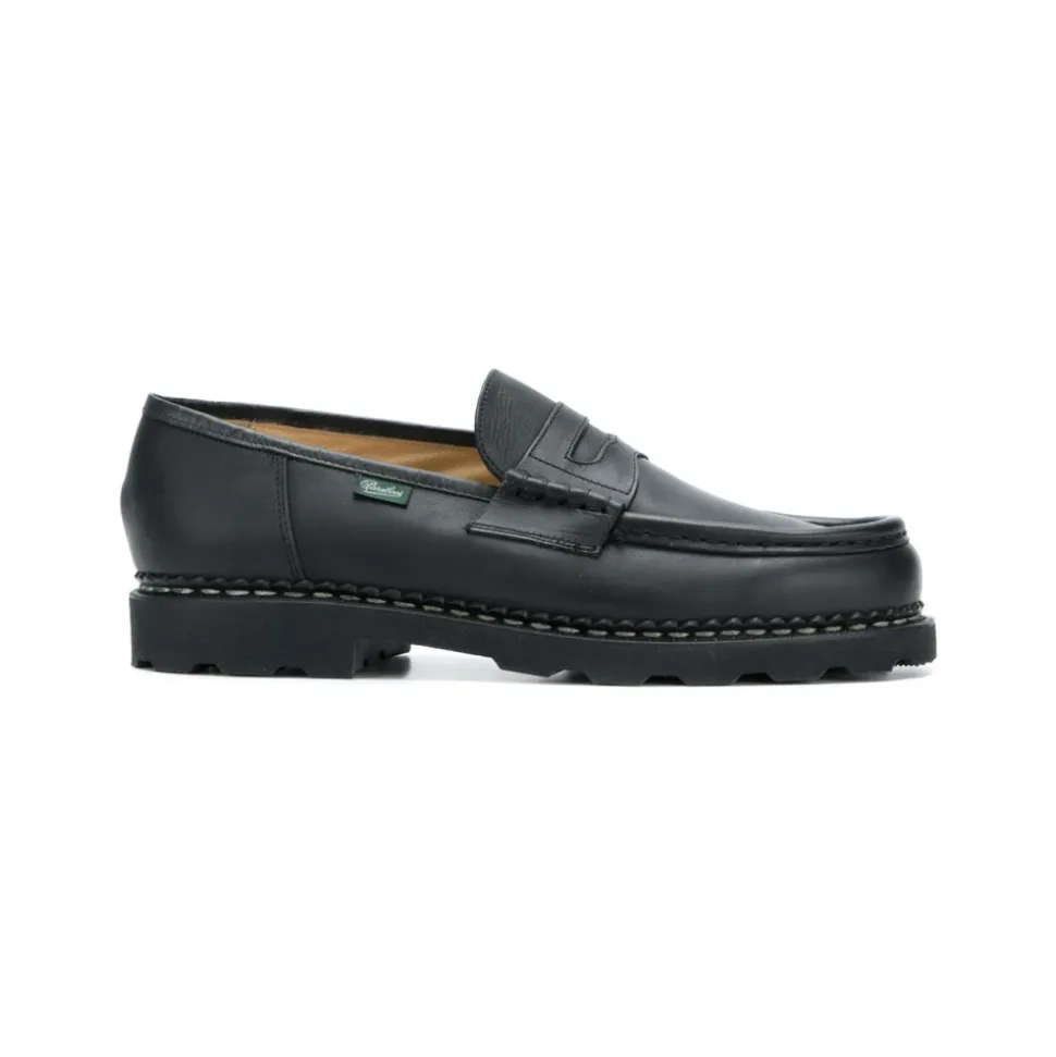 Træd ind i tidløs elegance med Reims Læder Loafers fra Paraboot, der har et elegant sort design og en behagelig pasform, der er perfekt til enhver lejlighed. Produkt detaljer: Sort | Kalvelæder | Slip-on stil | Distressed finish | Penny slot | Rund tå | Branded læder indersål | Chunky gummisål | Dimensioner og pasform: Almindelig pasform |