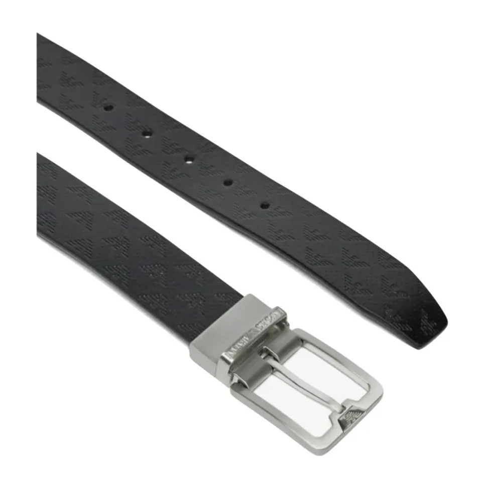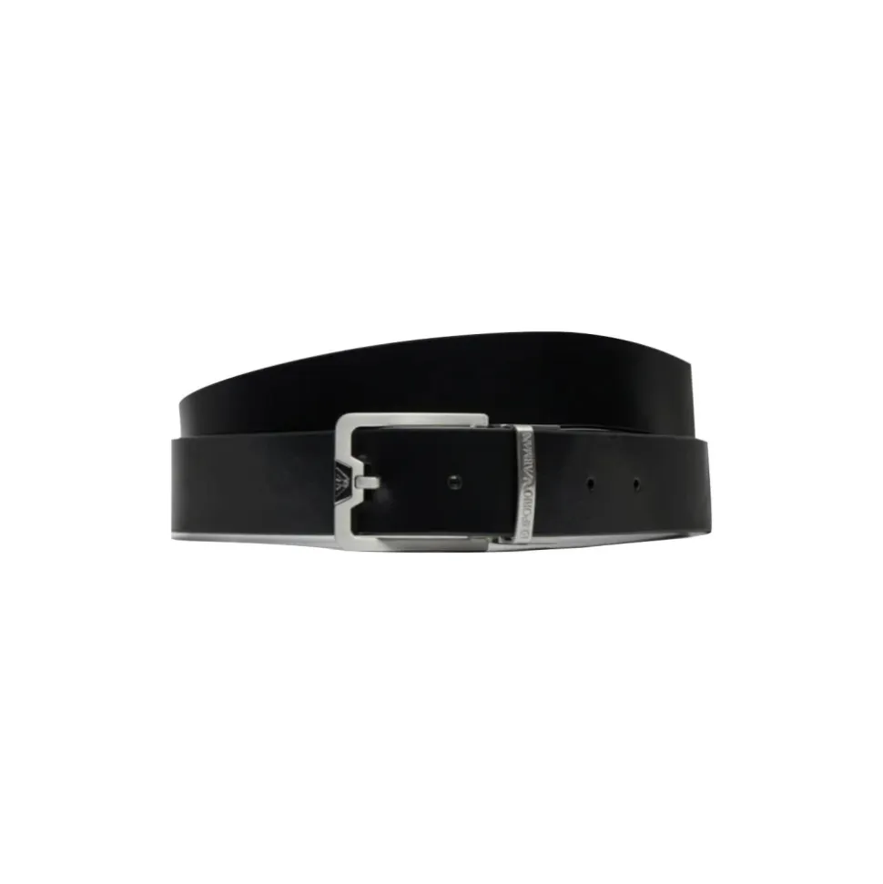 Armani reversibelt bælte i læder, designet til dobbelt brug med kontrasterende teksturer på hver side. Et alsidigt tilbehør, der skifter mellem en præget finish og en pebble finish med et logo spænde lukning. Nøgleattributter: Sort | Nero | Okse læder | Reversibelt design | Logo spænde med stiftlukning | Præget læder på den ene side | Pebble (palmellated) læder på den anden side | To-tekstur reversibel finish | Sammensætning & pleje: Okse læder