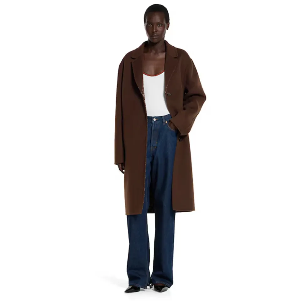 Gucci Reversible Silk Wool Coat tilbyder to forskellige looks i ét stykke, hvor du kan skifte mellem ensfarvet brun uld og silke og en brun/lyserød GG-motiv bagside. Den er designet til alsidighed og kombinerer skræddersyede detaljer med en vendbar dobbeltvævet konstruktion. Vigtigste egenskaber: Brun | Lyserød | Uld og silke | Vendbar | Uforet | Knaplukning | To sidelommer | Hakkrager | GG-motiv på bagsiden | Dobbeltvævet konstruktion | Sammensætning og pleje: 99% uld | 1% silke | Renseri