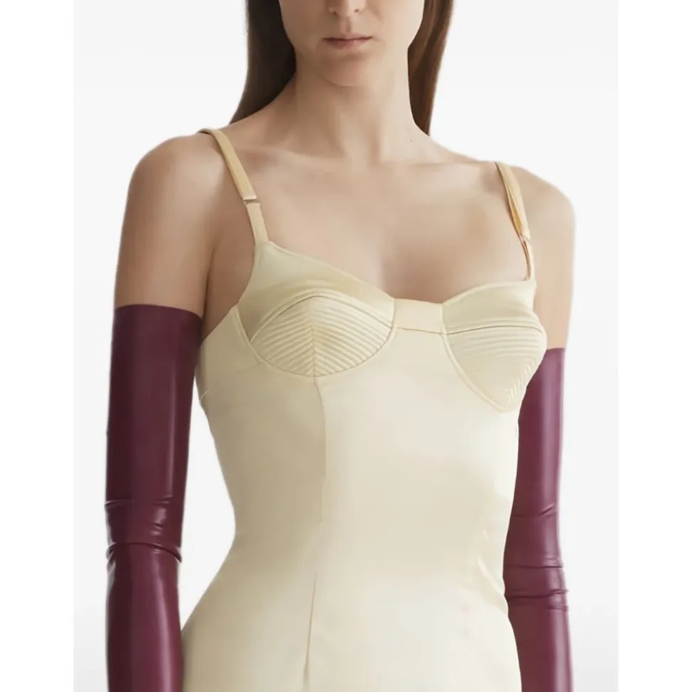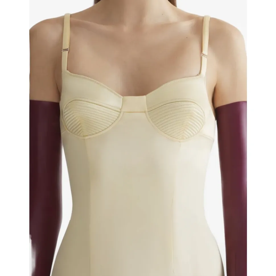 Mugler Ribbed Bodice Midi Dress kombinerer et skulpturelt ribstrikket livstykke med justerbare stropper og en firkantet halsudskæring for en ren, moderne silhuet. Ideel til hverdagsbrug eller afslappet aftenbrug, den lukkes med en lynlås bagpå for et figursyet look. Vigtige egenskaber: Beige | Hvid | Justerbare stropper | Lynlåslukning bagpå | Firkantet halsudskæring | Knælængde | Ribstrikket livstykke