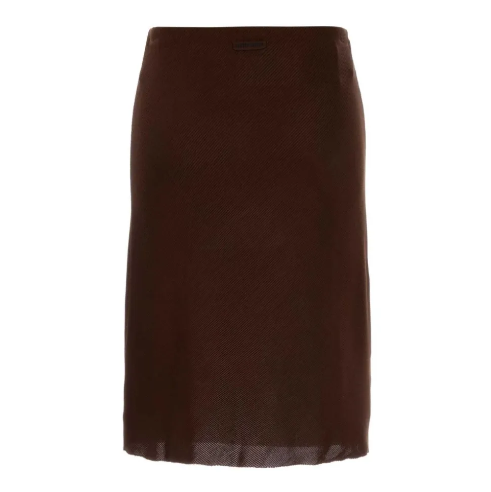 Miu Miu Ribstrikket Pencil Skirt kombinerer en subtil ribstrikket tekstur med en strømlinet midi-silhuet, designet til at løfte både hverdags- og aftenlooks. Nøgleattributter: Brun | Silke | Ribstrikket tekstur | Pencil silhuet | Midi længde | Dimensioner og pasform: Flatterende pasform | Sammensætning og pleje: 100% silke