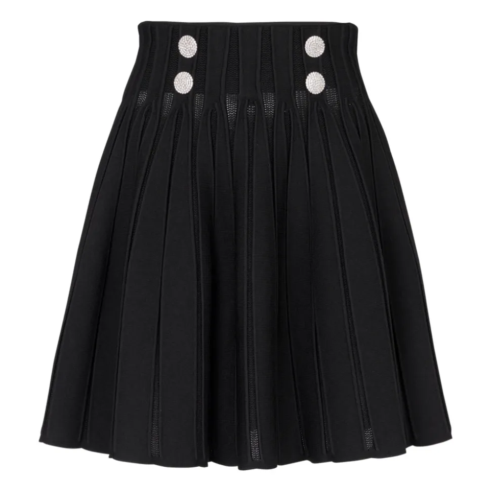 Skater nederdel i en tekstureret ribstrikket kvalitet. A-facon, markeret talje. 4 krystalpyntede knapper. Guldmetal lynlås i ryggen. Modellen måler 176 cm og bruger en størrelse 36. Materiale: 88% viskose, 12% polyester. Produceret i Italien. Varenummer: BF0LB927KF13. 100% af viskosefibrene, der er brugt til at lave dette tøj, er RCS-certificerede.