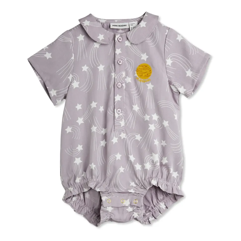 Mini Rodini Romper med print kombinerer et klassisk skræddersyet snit med blød, åndbar bomuld for behageligt hverdagsbrug. Nøgleattributter: Lilla | Bomuld | Åndbart stof | Blødt og skånsomt mod sart hud | Frontlukning for nem påklædning | Elastiske manchetter på ærmer og ben | Let at tage på | Peter Pan krave | Korte ærmer og ben | All-over stjerne- og skydelinjeprint | Dimensioner og pasform: Klassisk skræddersyet snit | Sammensætning og pleje: 100% bomuld | Maskinvask ved 40°C. Vask med vrangen ud. Må ikke bleges. Lufttørre.