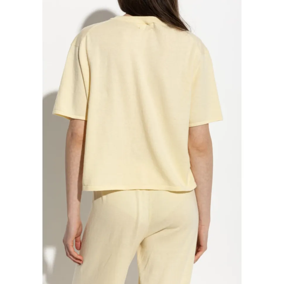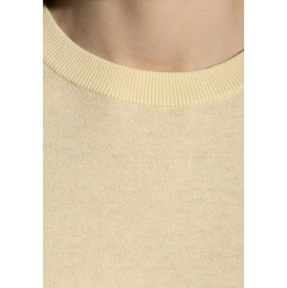 Rubie Top fra Lisa Yang er en minimalistisk striktrøje, der er skabt til et afslappet og raffineret look. Dens bløde bomulds-cashmere blanding og rene silhuet gør den velegnet til et løftet hverdagslook. Vigtige egenskaber: Gul | Bomulds-cashmere | Blød håndfølelse | Holdbar | Rund hals med ribkant | Brede, afslappede ærmer | Løs, let oversized silhuet | Ingen logoer eller tryk | Dimensioner og pasform: Modelhøjde: 177 cm | Bryst: 83 cm | Talje: 61 cm | Hofter: 89 cm | Modellen er iført størrelse: 1 | Løs, let oversized pasform | Sammensætning og pleje: 70% bomuld | 30% cashmere | Rens eller håndvask kold. Brug ikke blegemiddel eller skyllemiddel. Lægges fladt til tørre; vrid ikke. Brug kun strygejern ved lav varme.