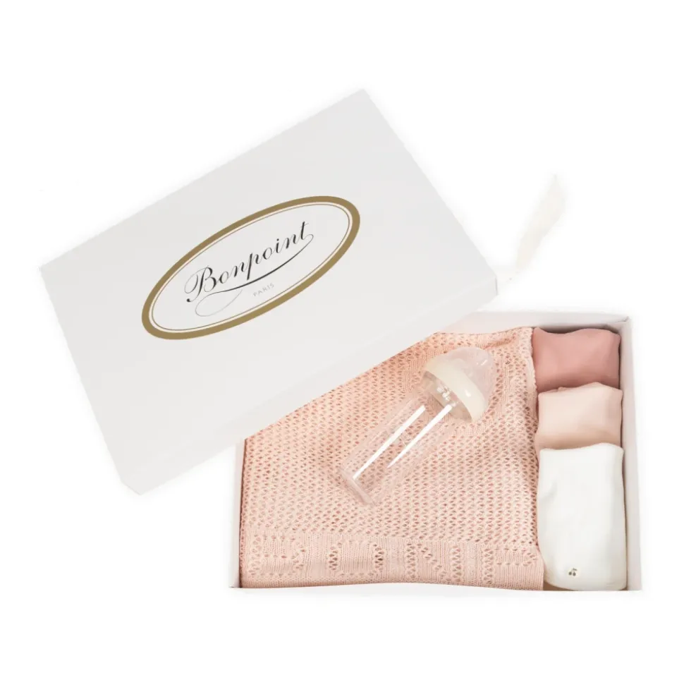Bonpoint sæt med tæppe og spisesæt kombinerer raffineret fransk design med praktiske spiseartikler, præsenteret i en gaveæske med logo og centreret omkring et strikket tæppe, tre hagesmække og en sutteflaske. Vigtige egenskaber: Pink | Uld og bomuld | Behageligt | Holdbart | Velcro-lukning på hagesmækkene | Inkluderer tæppe, tre hagesmække og flaske | Præsenteret i en gaveæske med logo | Gennembrudt strikmønster | Dekorative tæppekanter | Simpelt, elegant hagesmækdesign | Transparent sutteflaske | Mål & pasform: Bredde: 78 cm | Længde: 85 cm | Sammensætning & pleje: Uld | Bomuld