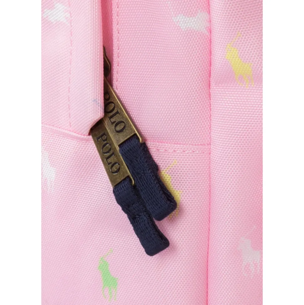 Lyserød Ralph Lauren rygsæk med all-over multicolor logo Levende og karakteristisk design: lyserød rygsæk dekoreret med Ralph Lauren-logo all-over i multicolor-version, for en frisk og munter stil. Holdbart materiale: lavet af robust stof for at sikre holdbarhed og modstand mod daglig brug. Funktionel og rummelig: stort hovedrum med lynlås og frontlomme til opbevaring af mindre genstande. Omhyggelige detaljer: lynlåse med brugerdefinerede træk og forstærkede syninger. Alsidig: perfekt til skole, sportsaktiviteter, ture eller fritid.