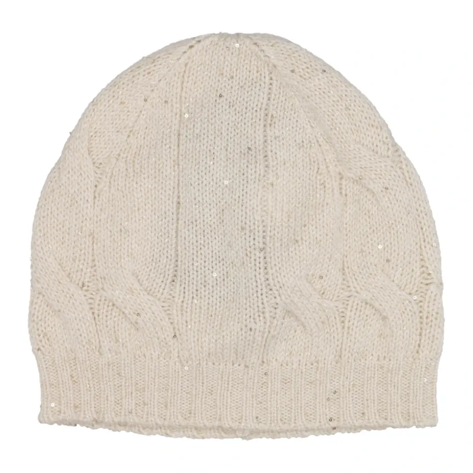 Gran Sasso Sequin Cable Beanie kombinerer en blanding af uld og cashmere med mikro-pailletter for en raffineret tekstur og subtil glans. Kabelstrikhue med lodrette ribber og en ribkant giver struktureret dækning og en sikker pasform. Vigtige egenskaber: Beige | Creme | Uld- og cashmereblanding | Ribkant | Huestruktur | Mikro-pailletter overalt | Kabelstrik | Lodrette ribber | Fremstillet i Italien | Sammensætning og pleje: Uld | Cashmere