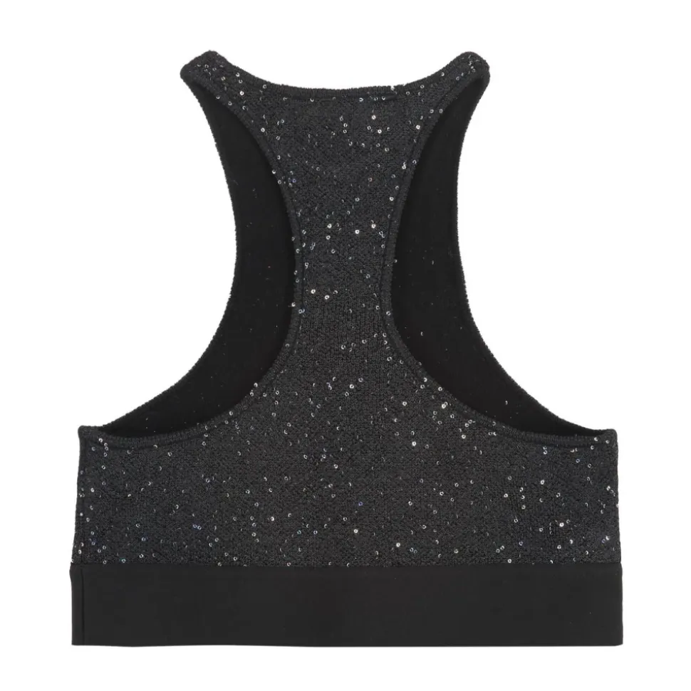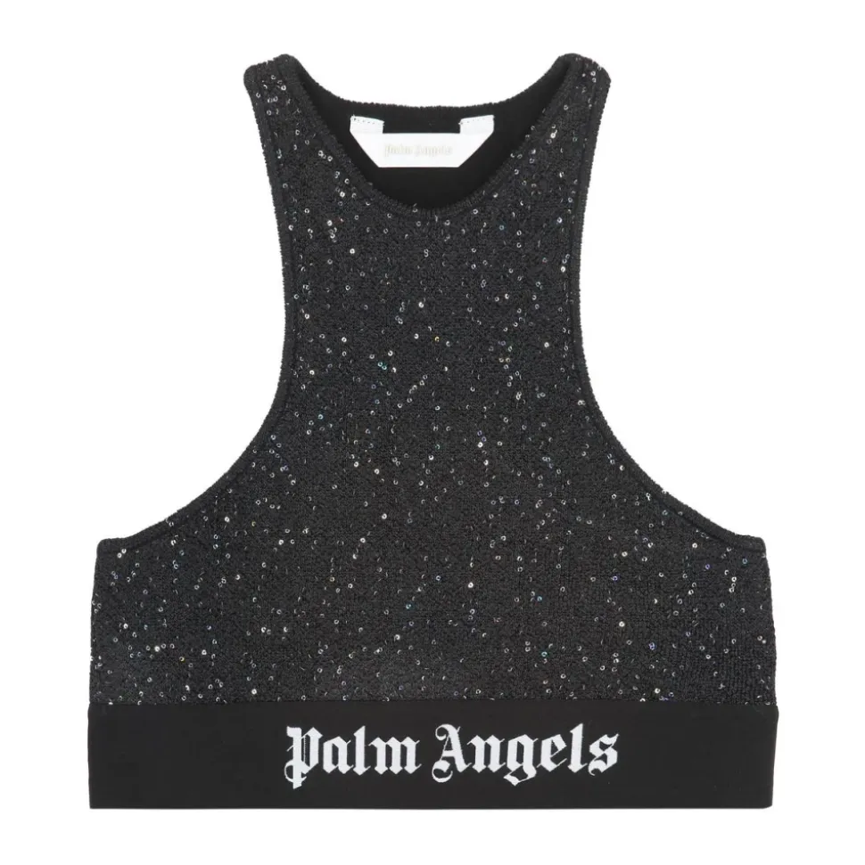 Palm Angels Sequin Knit Sports BH kombinerer brandets signaturattitude med pailletbesat strik for et stykke, der fungerer til træning og aftenbrug. Det croppede stretchdesign har en brandet elastikkant for sikker støtte og en high-fashion finish. Vigtigste egenskaber: Sort | Strikstof | Stretchstof | Elastisk underkant med logo | Pulloverdesign | Ærmeløs | Pailletdetaljer | Cropped silhuet | Rund halsudskæring | Kontrastlogobånd | Dimensioner og pasform: Cropped pasform | Slim fit | Sammensætning og pleje: Renseri