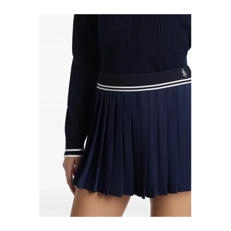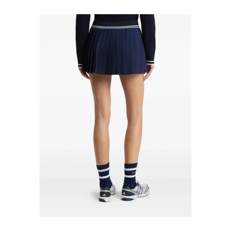 Sporty & Rich Serif Logo Plisseret Nederdel kombinerer en klassisk plisseret silhuet med en elastisk linning med logo-detalje for et sporty, preppy look. Den er designet til nem brug og hverdagsstyling. Nøgleattributter: Mørkeblå | Blå | Elastisk linning | Plisseret design | Logo detalje | Trim detalje | Dimensioner & pasform: Regular fit