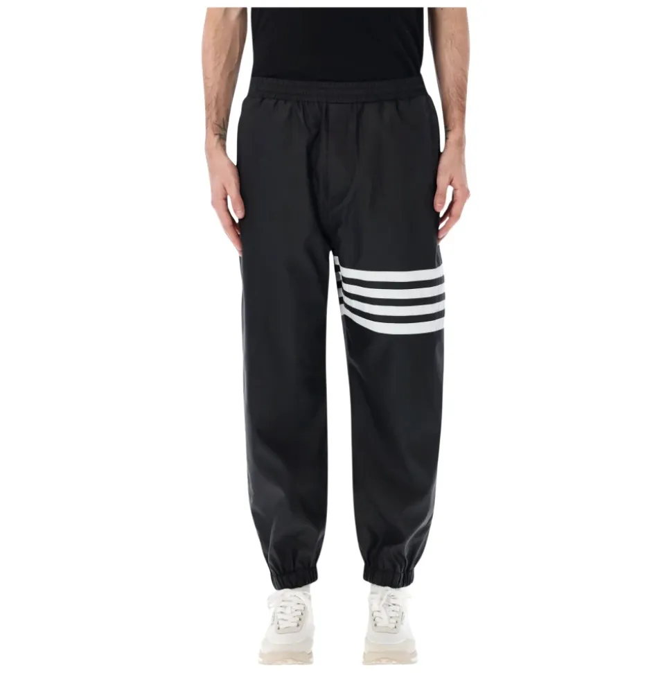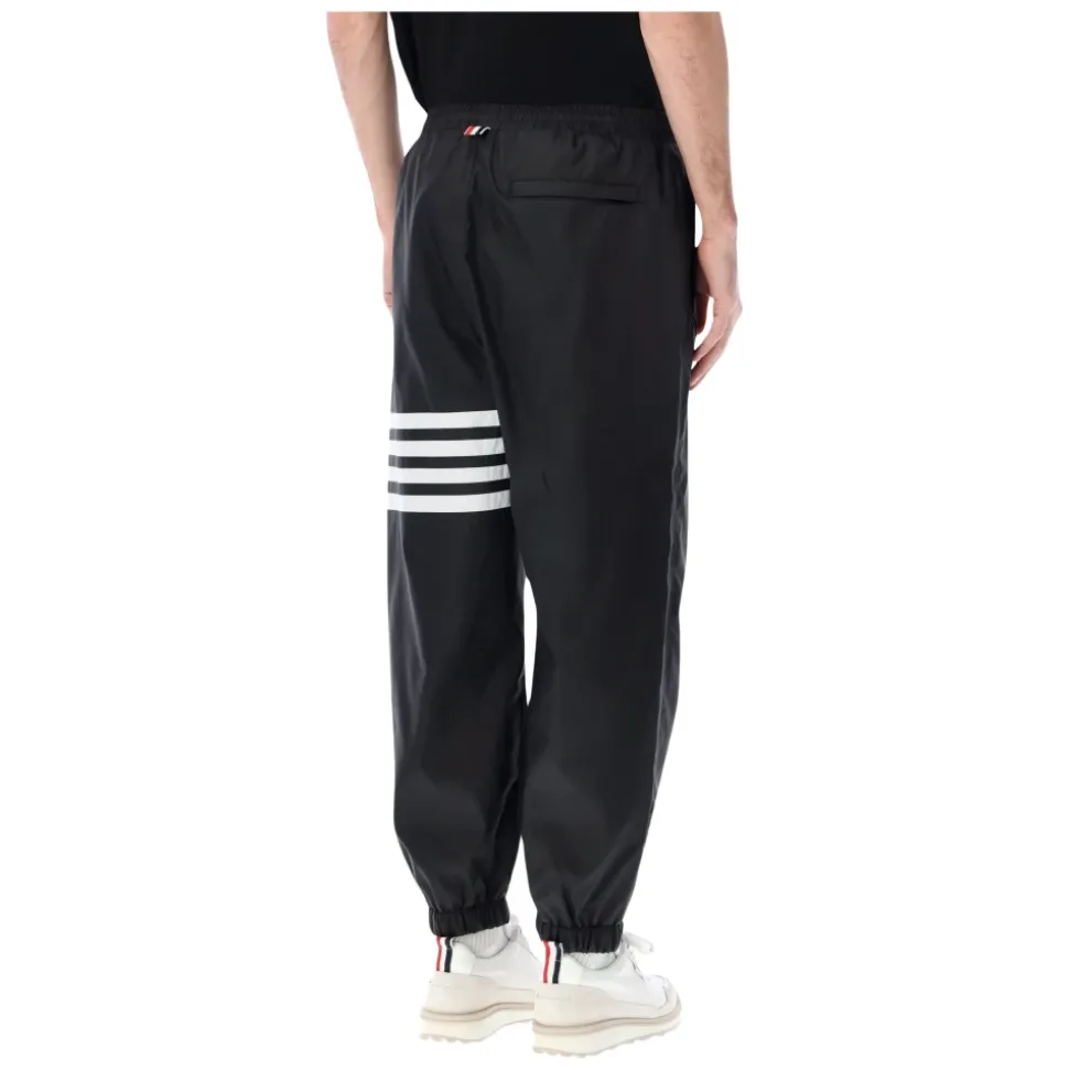 Thom Browne Shiny Ripstop 4-Bar Track Pants kombinerer teknisk ripstop-stof med mærkets signatur 4-Bar stribe for et raffineret atletisk look. Designet til aktiv og hverdagsbrug, de balancerer letvægtsperformance med skræddersyede detaljer. Vigtige egenskaber: Sort | Nero | Polyamid ripstop | Letvægt | Vejrbestandig | Elastisk snøre i taljen | Lynlåsgylp | Sidelommer med skjulte lynlåse | Paspoleret baglomme med skjult lynlås | Mesh-foring | Elastiske manchetter | Signatur 4-Bar stribe ved benet | Tricolor grosgrain loop bagpå | Shiny ripstop finish | Jogger-stil silhuet | Dimensioner & pasform: Normal i størrelsen | Tilspidset ben med elastiske manchetter | Sammensætning & pleje: 81% polyamid, 19% polyester | Kontrast: 100% polyester | Foring: 100% polyester | Kun kemisk rensning.