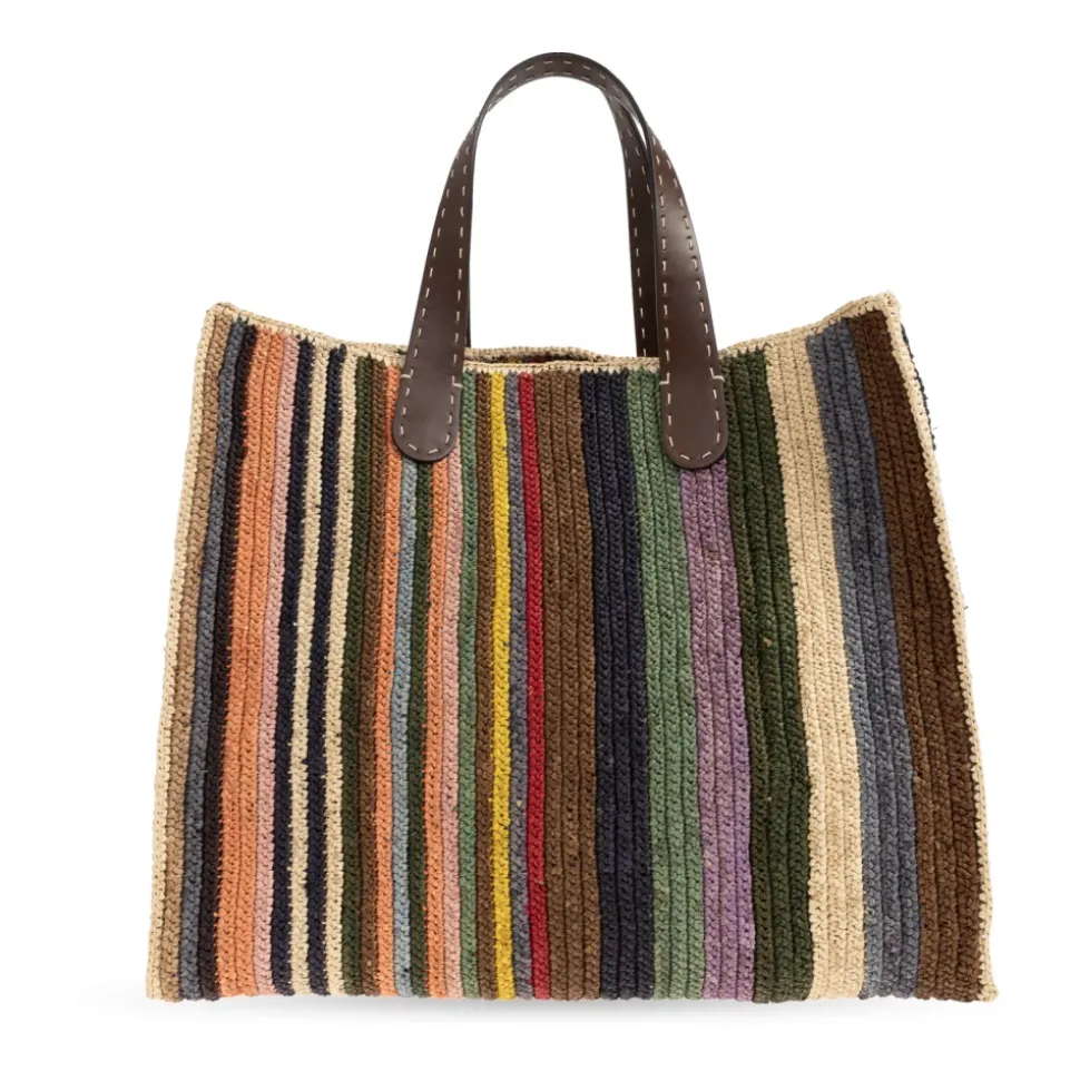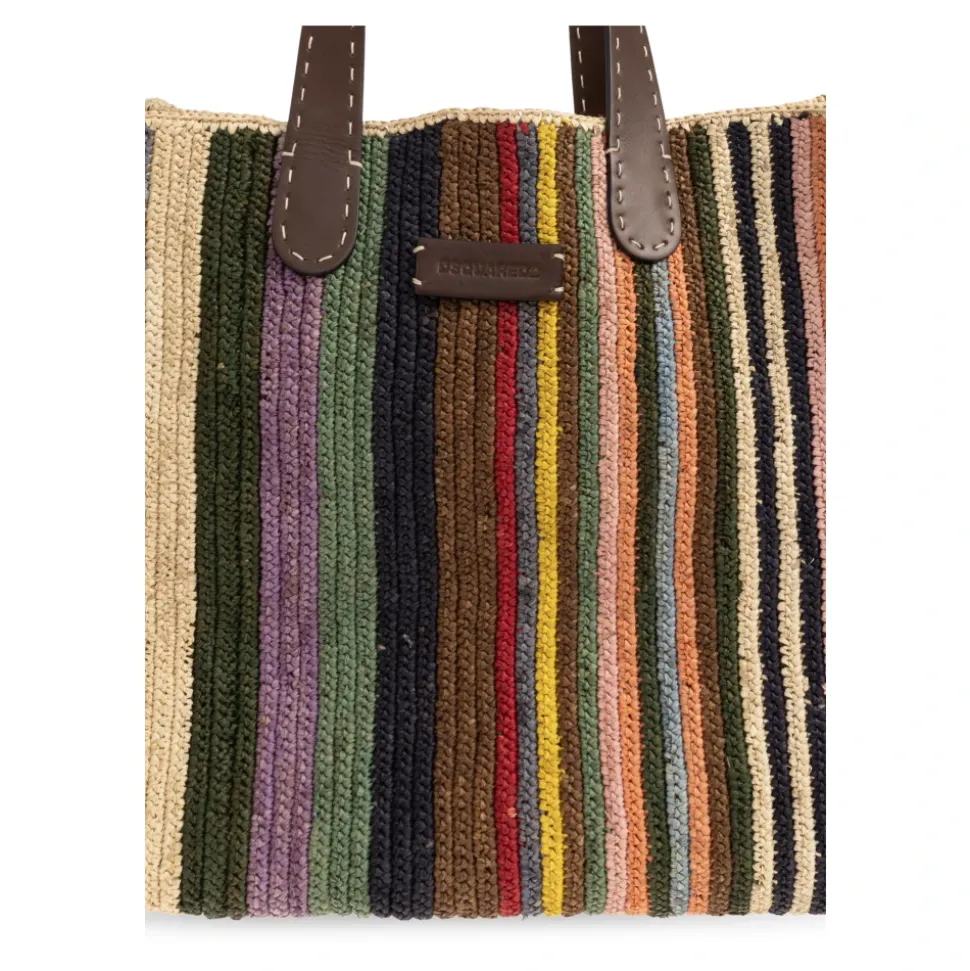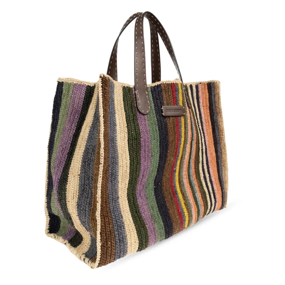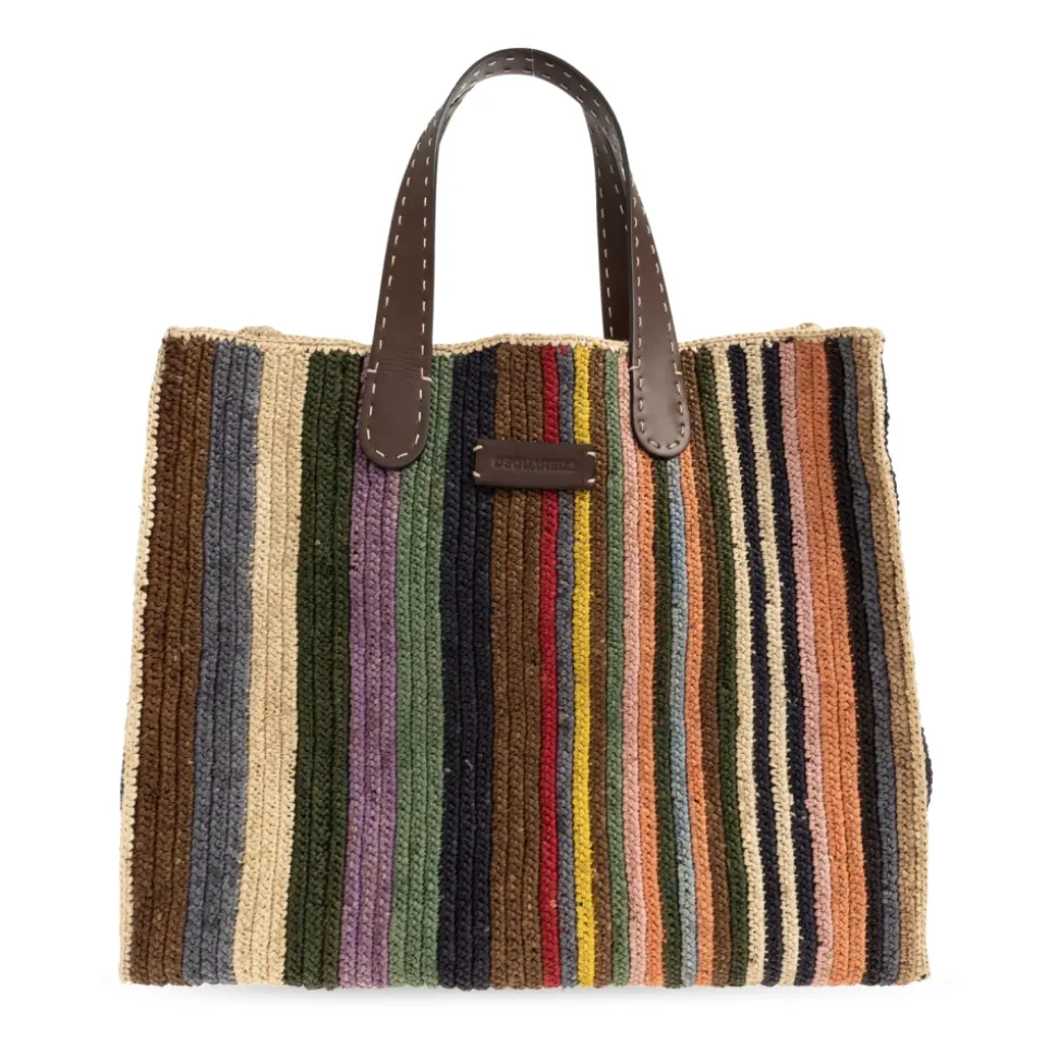 Dsquared2 Shopper Skuldertaske kombinerer en dristig, flerfarvet stribet raffiavævning med dybbrune læderdetaljer. Den rummelige, rektangulære silhuet og forstærkede hanke gør den til en alsidig hverdagstaske. Nøgleattributter: Flerfarvet | Raffia | Holdbar konstruktion | Omhyggelig finish | Rummeligt interiør | Indvendig læderlomme | Læderhanke | Skuldertaske | Lodrette striber | Geometrisk rektangulær form | Tyk vævet raffia tekstur | Læderlogo patch | Flerfarvet mønster | Dimensioner og pasform: Højde: 37 cm | Bredde på bredeste sted: 44 cm | Bundbredde: 19 cm | Sammensætning og pleje: Raffia | Læder