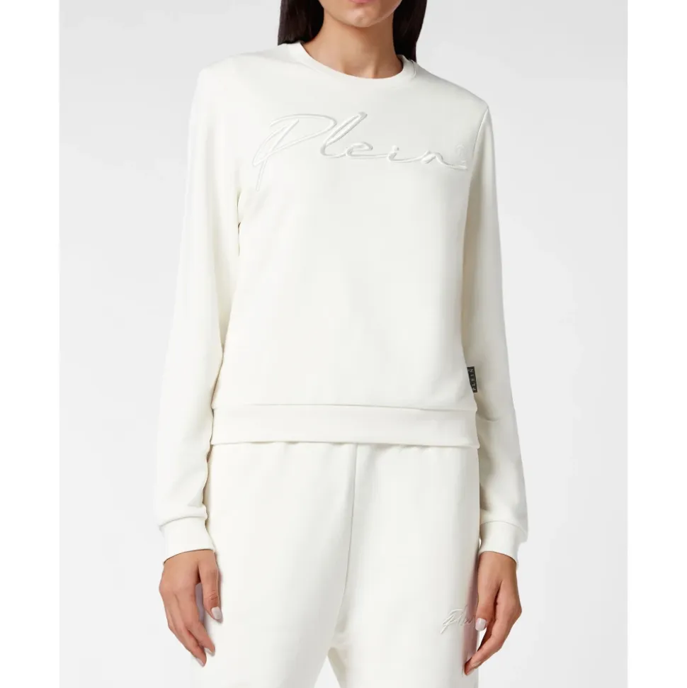 Philipp Plein Signature Sweatshirt kombinerer afslappet komfort med en ophøjet æstetik, med broderede logodetaljer og ribkanter for en raffineret finish. Brug den alene eller lag den med joggingbukser eller jeans for et sofistikeret, afslappet look. Nøgleattributter: Beige | Creme | Bomuld | Komfortabel | Holdbar | Alsidig til lagdeling eller brug alene | Tætsiddende ribkanter for en raffineret pasform | Broderede logodetaljer | Ribkanter | Ophøjet silhuet | Sammensætning & pleje: Bomuld