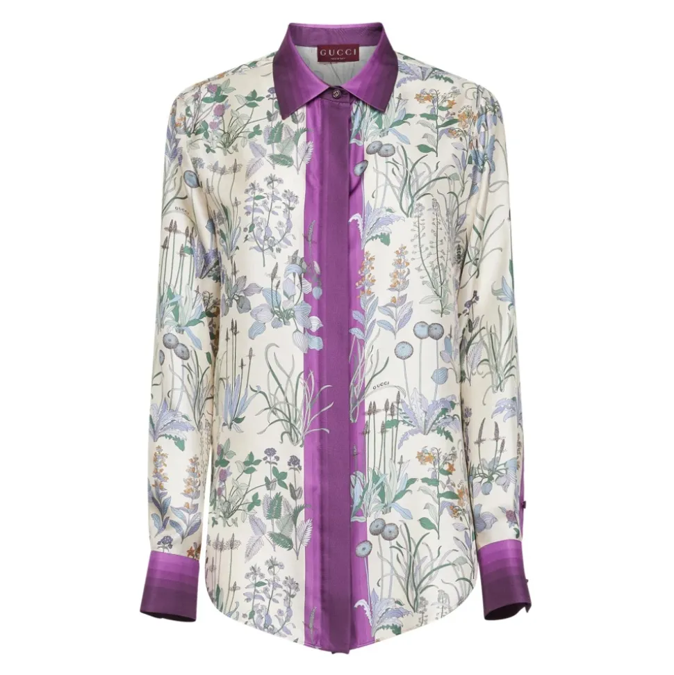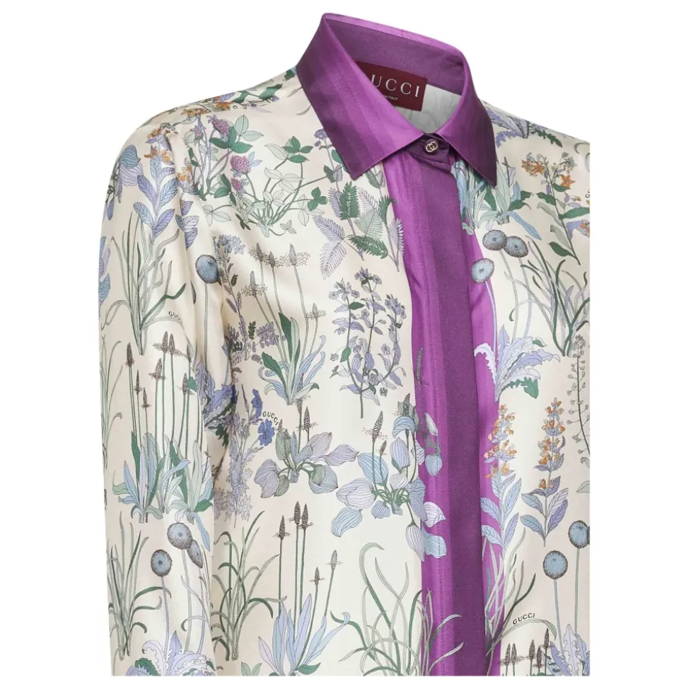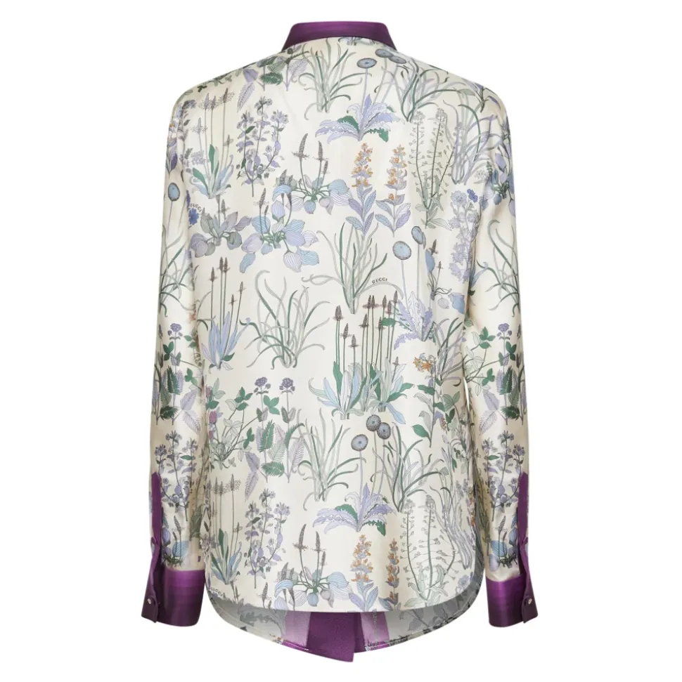 Gucci silkeskjorte i twill med print er en flydende silkeskjorte, der er defineret af et all-over Flora-print og asymmetrisk, sænket forkant. Den kombinerer luksus med print med skræddersyede detaljer til et elegant look fra dag til aften. Vigtigste egenskaber: Multicolor | Ivory | Purple | Mc | Silke | Dækket knapstolpe foran | Knaplukning foran | Manchetter med knapper | Uforet | Formede sideslidser for nem bevægelse | Spids krave | Lange ærmer | Asymmetrisk, sænket og spids forkant | All-over Flora-print | Stribet detalje med gradient-effekt ved krave, stolpe og manchetter | Formede sideslidser ved kant | Mål og pasform: Længde: 67,8 cm (baseret på størrelse IT 40) | Normal i størrelsen | Lige pasform | Sammensætning og pleje: 100% silke | Kun kemisk rens