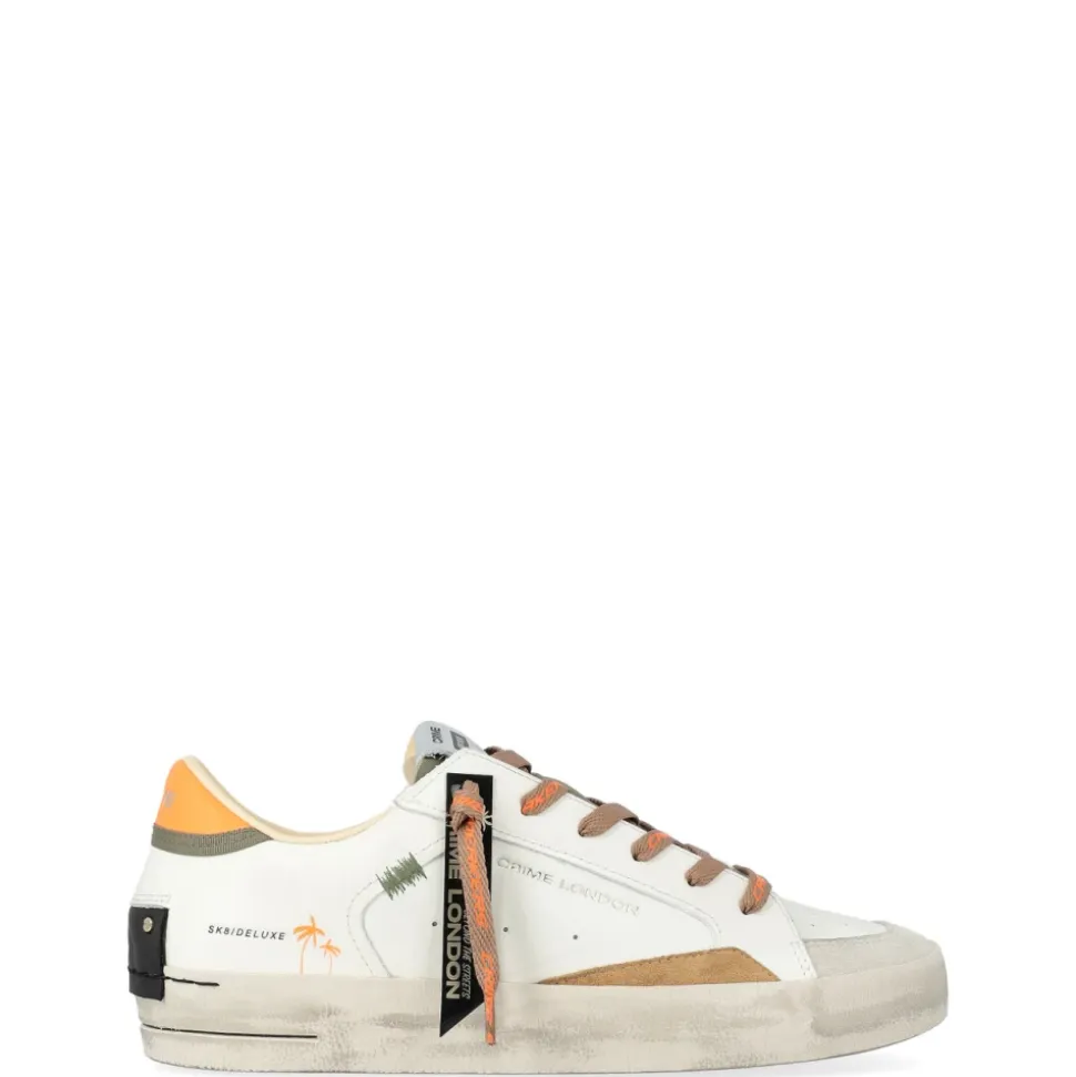 Crime London Sk8 Deluxe er en hvid lædersneaker med detaljer i ravfarvet ruskind og en vintage finish, designet til skate-inspireret hverdagsbrug. Distinkte detaljer – som en neon orange læderstrop bagpå og en kaki-farvet stofpløs med et læderlogo-mærke – giver den et markant look. Vigtige egenskaber: Hvid | Grigio | Læder | Læder- og tekstilfor | Ravfarvede ruskind detaljer | Neon orange læderstrop bagpå | Kaki-farvet stofpløs med læderlogo-mærke | Sort læder patch bagpå | Enkelt blankt sort tag | Vintage finish | Sammensætning & pleje: Læder | Ruskind | Stof
