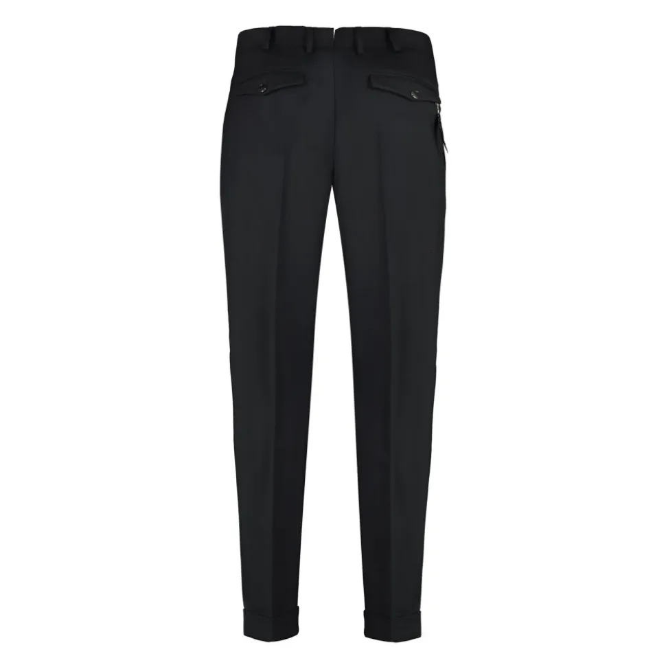 PT01 Skræddersyede bukser leverer præcis skræddersyning og en plisseret front til formelle lejligheder. Disse bukser giver en raffineret silhuet, der er ideel til polerede kontor- og festoutfits. Nøgleattributter: Sort | Jomfruuld | Bæltestropper | Lynlås- og hægtelukning | To sidelommer | To baglommer med knaplukning | Plisseret front | Pressede folder | Opsmøg | Konisk ben | Raffineret silhuet | Dimensioner & pasform: Skræddersyet pasform | Sammensætning & pleje: 95% Jomfruuld | 5% Elastan