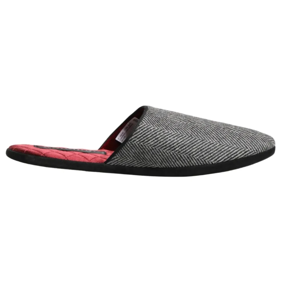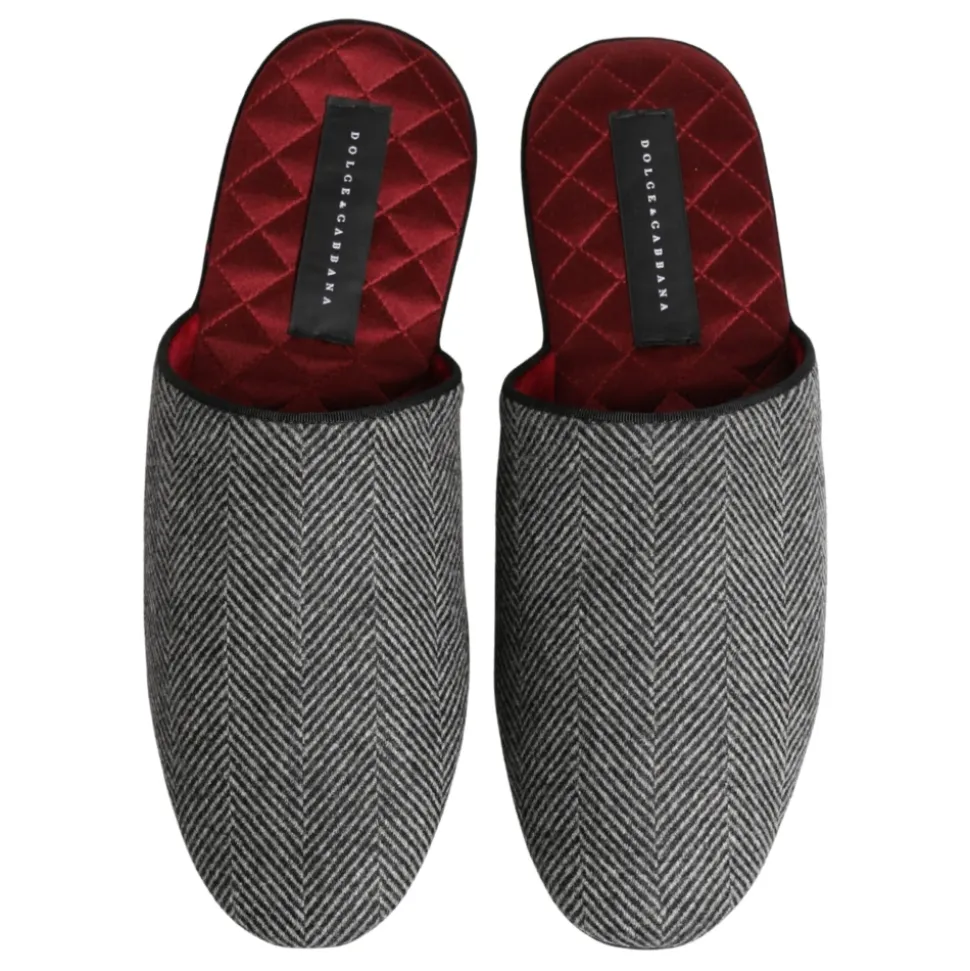 Dolce & Gabbana slip-on hjemmesko kombinerer et gråt sildebensvævet cashmere-blend ydre med et quiltet bordeauxrødt interiør for raffineret komfort i hjemmet. De er fremstillet i Italien og tilbyder blød isolering og en gummisål for et mere luksuriøst loungewear look. Nøgleattributter: Grå | Bordeauxrød | Cashmere-blend | Varmt, isoleret interiør | Komfortfokuseret konstruktion til indendørs brug | Slip-on design | Gummisål | Sildebensvævet ydre | Quiltet bordeauxrødt interiør | Logo detalje | Sammensætning & pleje: Cashmere-blend | Gummisål