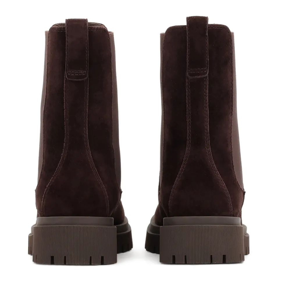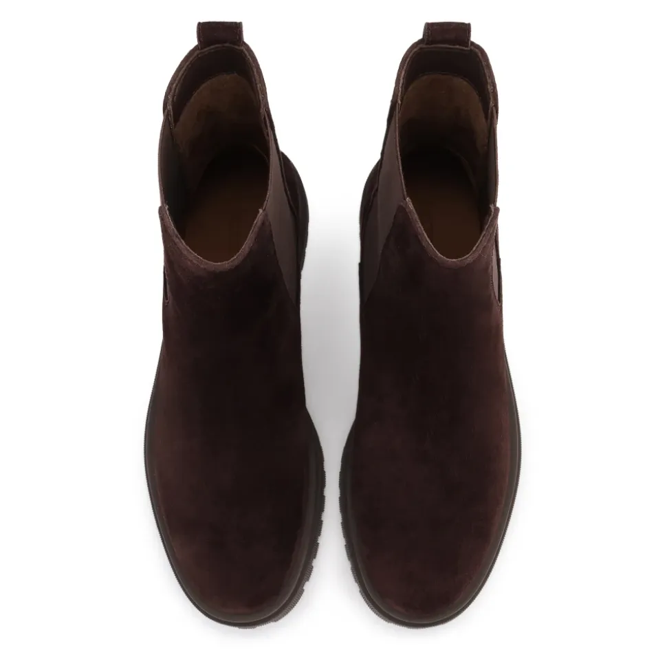 Slip-on Chelsea-støvler lavet af brunt ruskind er et tidløst forslag med et naturligt, sæsonbetonet udseende. Det bløde overlæder med en klassisk pasform er udstyret med elastiske sideindsatser, der sikrer behagelig påtagning og en perfekt pasform til foden. Fløjlsskindets tekstur i en dyb brun farve giver modellen en subtil elegance og universel karakter. Den karmoisinrøde sål med en markant mønster garanterer god greb og komfort til daglig brug. Dette er en model, der kombinerer stilfuld enkelhed med praktisk anvendelighed – perfekt til bymæssige og afslappede outfits til de koldere dage. Foret lavet af semianilin-fåreskind giver enestående komfort under brug takket være dets fremragende fugtabsorberende egenskaber.