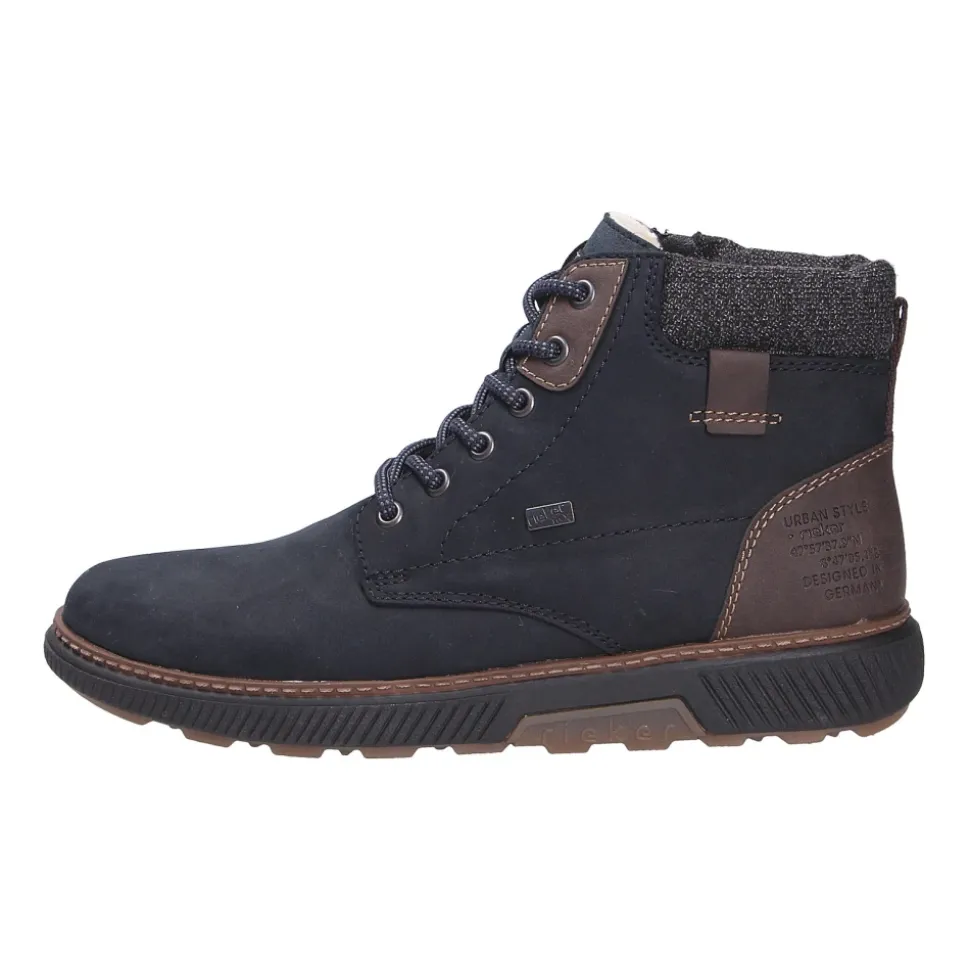 Rieker snørestøvler kombinerer blødt nubucklæder med et varmt uldfoer for pålidelig komfort i koldt vejr. Støvlen har en vandafvisende RiekerTex-membran og en skridsikker gummisål til daglig brug i vådt vejr. Nøglefunktioner: Blå | Blau | Nubucklæder | Vandafvisende membran (RiekerTex) | Varmt uldfor | Slidstærk, skridsikker gummisål | Snørelukning for justerbar pasform | Aftagelig, blødt polstret tekstilindersål | Ekstra plads til at rumme ortopædiske indlæg | Blød, børstet nubuckoverflade | Rund snude | Flad, kontinuerlig lav hæl | Mål og pasform: Almindelig størrelse (normal i størrelsen) | Bredde: H (bred pasform) – ekstra plads til bredere fødder | Medium skaftbredde – egnet til normal lægomkreds | Aftagelig indersål skaber plads til specialfremstillede ortopædiske indlæg | Sammensætning og pleje: Nubucklæder | Uld (foer) | Tekstil (aftagelig indersål) | Gummi (sål) | RiekerTex membran