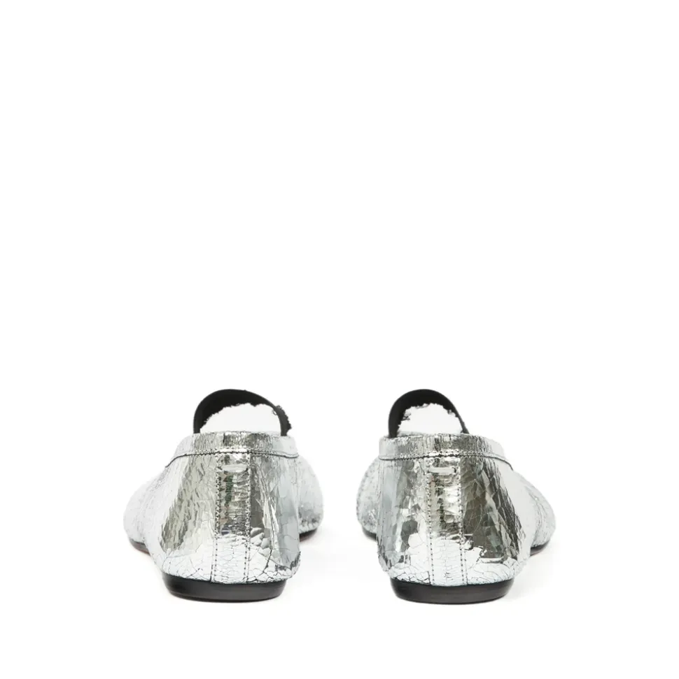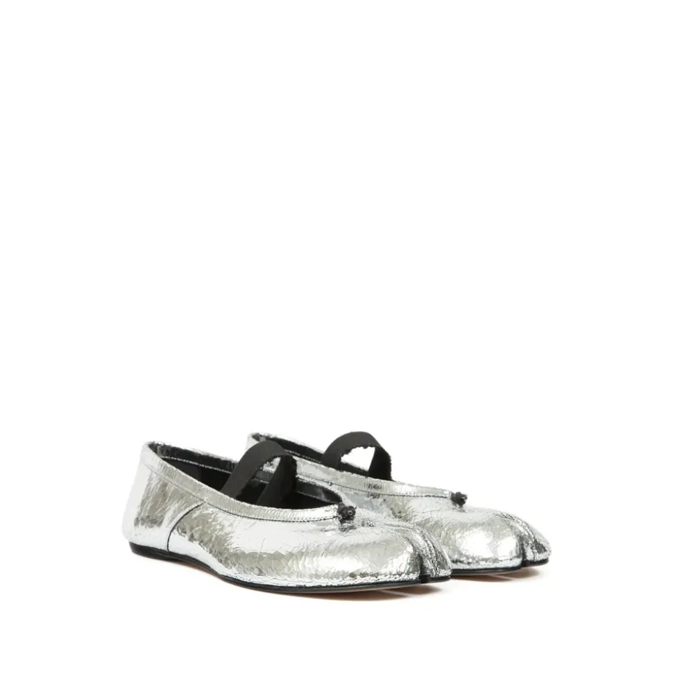 Forkæl dig selv med Maison Margielas sølv elastiske stropper og signatur Tabi tå slip-on ballerinaer. Fremstillet af 100% kalveskind, disse flade sko er et must-have for den moderne kvinde.