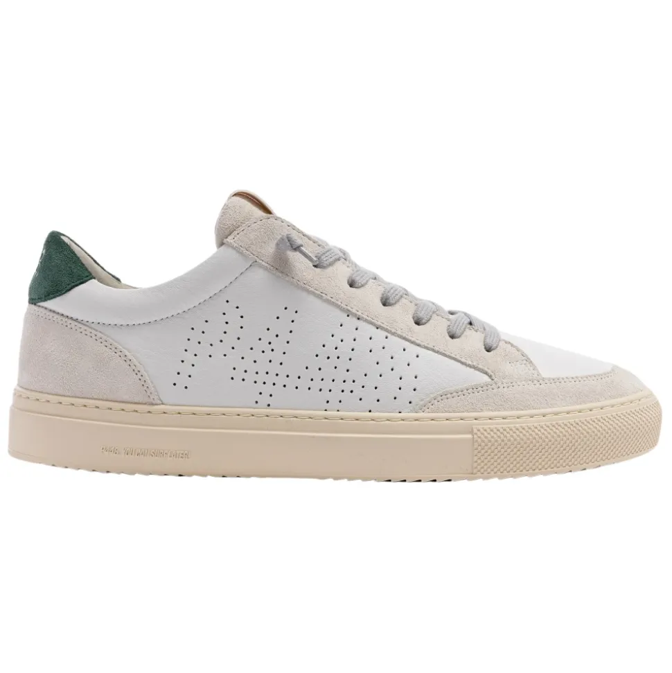 P448 Soho sneakers i en farveblokket læder- og ruskindskonstruktion, designet til hverdagsbrug med en karakteristisk P448 gummisål. Designet kombinerer en hvid og mørkegrøn palet med aftagelige snørebånd for at holde looket friskt. Vigtige egenskaber: Hvid | Grøn | Læder og ruskind | Sokforing for komfort | P448 gummisål for stødabsorbering | Grå bomuldssnørebånd inkluderet | Ekstra par hvide bomuldssnørebånd | Farveblokket læder og ruskind | Lav silhuet | Cremefarvet slidbane | Dimensioner og pasform: Normal i størrelsen | Sammensætning og pleje: Læder | Ruskind | Bomuld (snørebånd) | Gummi (sål)
