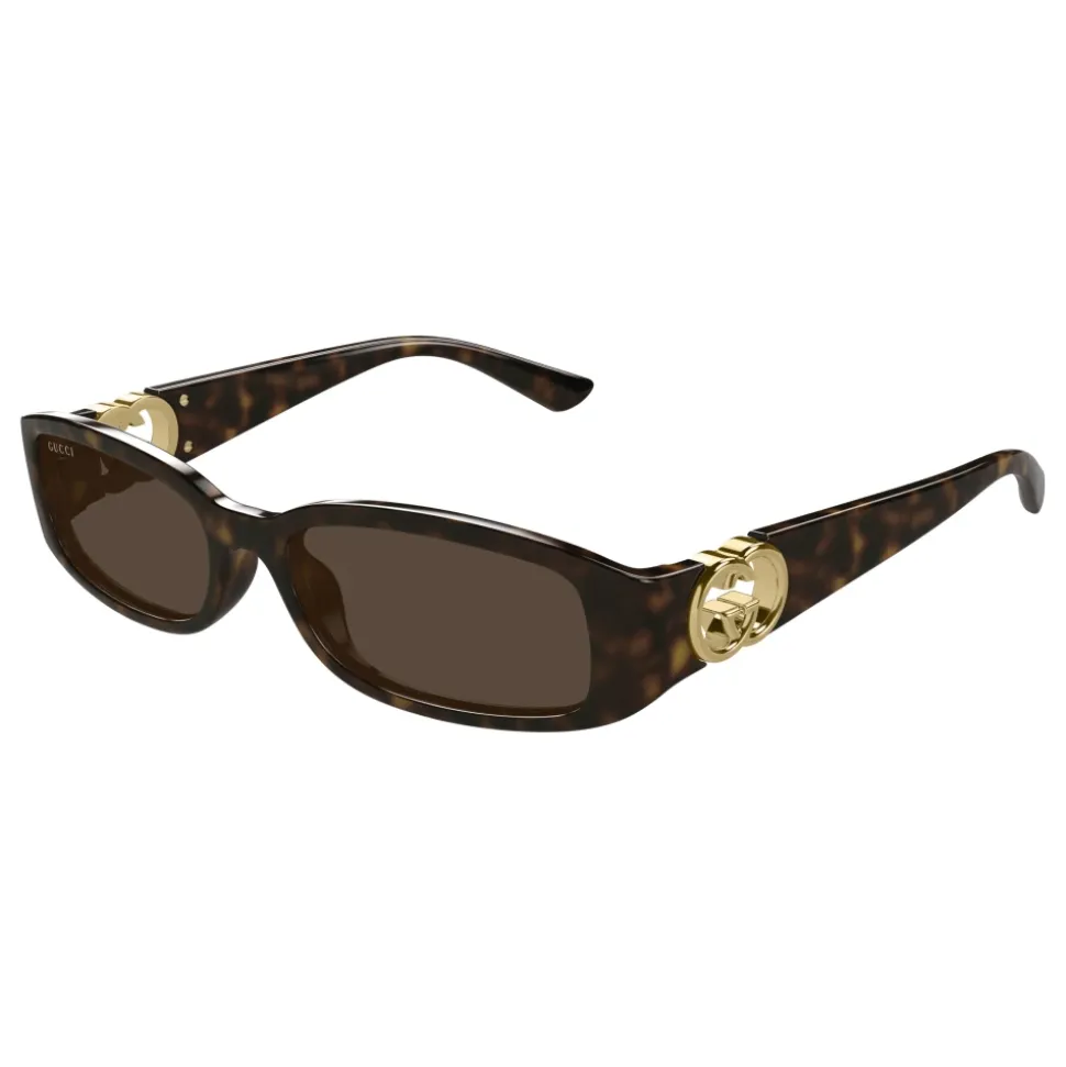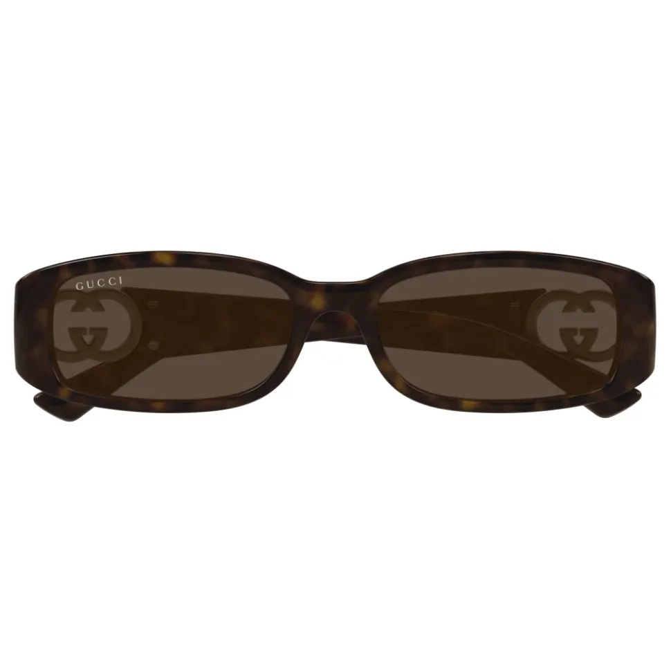 Fremhæv din stil med disse Havana-print Gucci rektangulære solbriller til kvinder. Med indsprøjtet plastikramme, brune linser og guldfarvet GG-logo på siderne. Linsebredde: 54 mm; Næsebroens længde: 16 mm; Tamplets længde: 135 mm. Lavet af høj kvalitetsplastik.