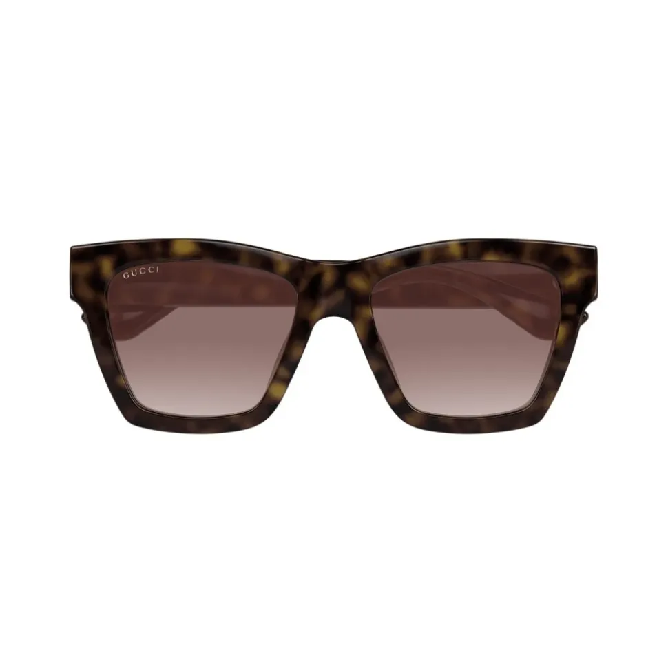 Forøg din stil med disse Gucci rektangulære solbriller med Havana-print acetatramme og brune nylonlinser. Prydet med et guldtone logo på siderne, tilbyder disse solbriller 100% UV-beskyttelse. Linsebredde: 53 mm; Næsebroens længde: 19 mm; Tempellængde: 140 mm.