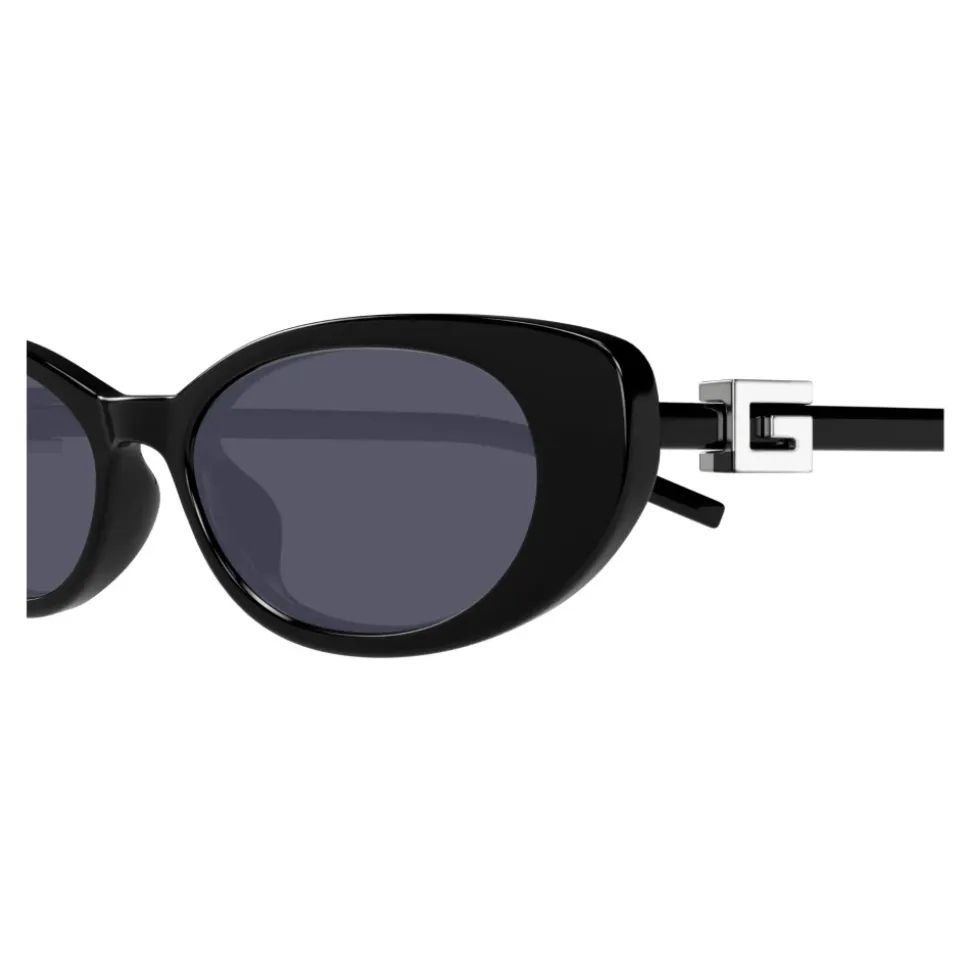 Forøg din stil med disse sorte Gucci ovalformede solbriller til kvinder. Med en acetatramme, tynde kanter og mørkegrå nylonlinser. Det sølvfarvede logo på siderne tilføjer et strejf af luksus. Linsebredde: 52 mm; Næsebroens længde: 17 mm; Tempellængde: 140 mm.