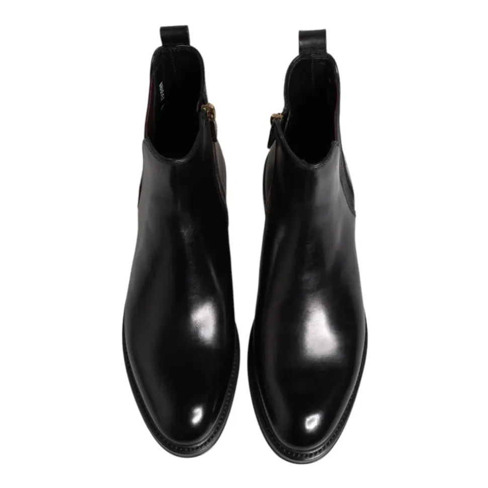 Forkæl din stil med disse spritnye 100% autentiske Dolce & Gabbana herre sorte Chelsea læderstøvler til midt på læggen. Med et elegant design med strækbånd for nem ind- og udgang og en lynlåslukning i siden. Fremstillet af førsteklasses materialer, herunder 80% læder, 15% polyester og 5% elastan for en god pasform og komfort. Det ydre lædersål sikrer holdbarhed og en luksuriøs følelse. Produceret i Italien med detaljerede logo-accents.