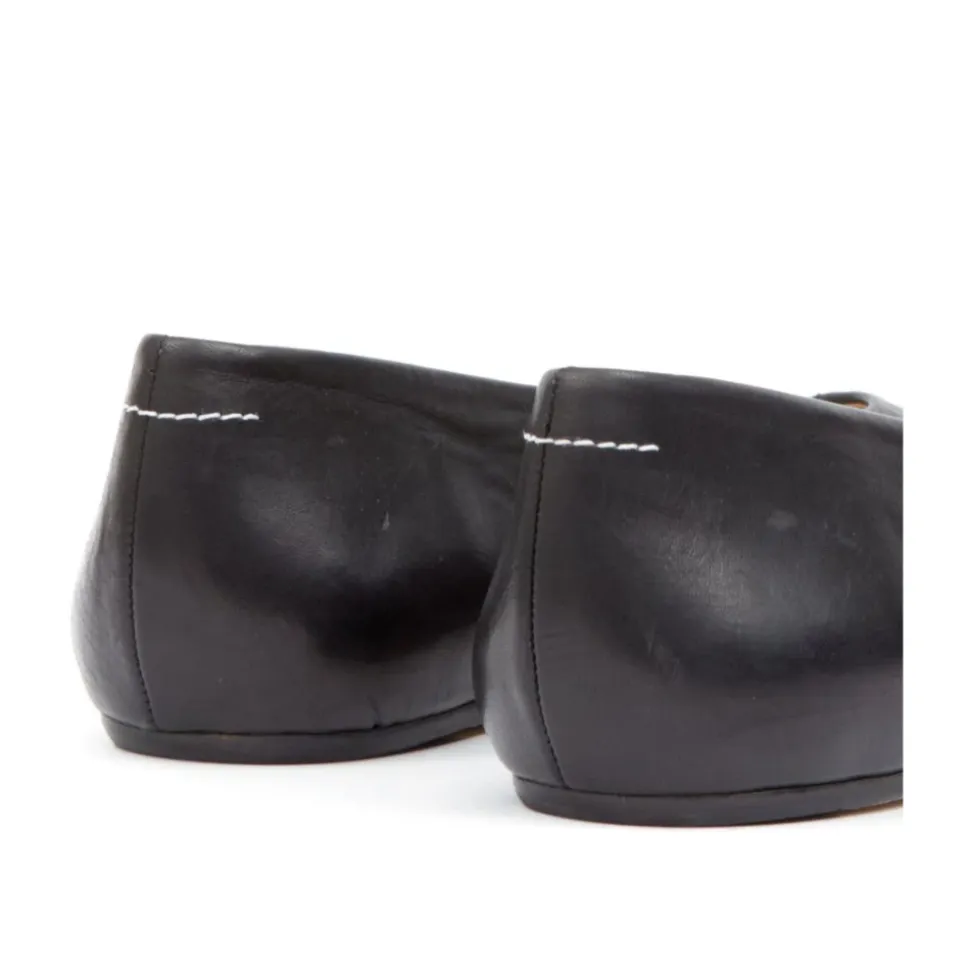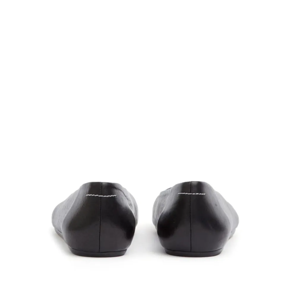 Forkæl dig selv med disse MM6 Maison Margiela sorte ballerinaer i kalveskind med glat korn, signatur enkeltsting logo, moc syning, asymmetrisk tå, branded læderindersål, flad sål og træk-på stil.