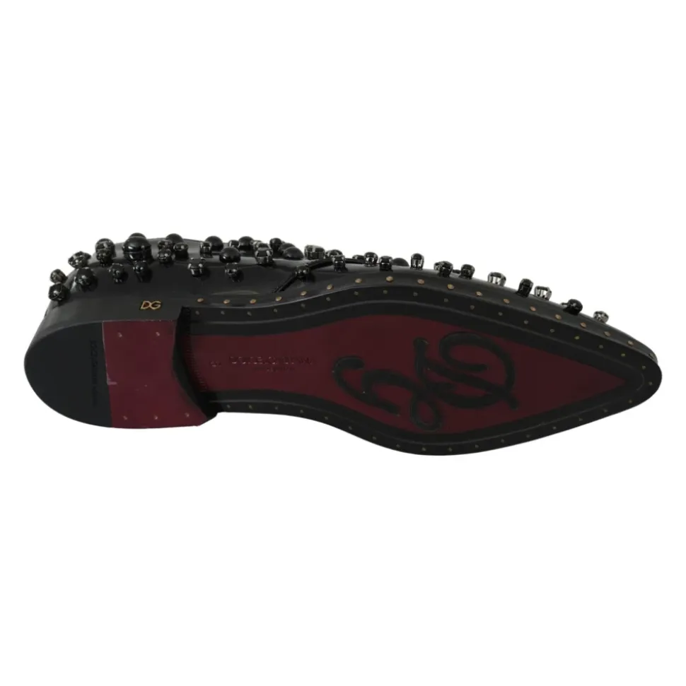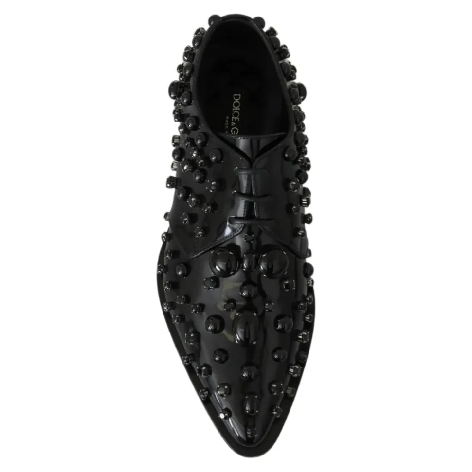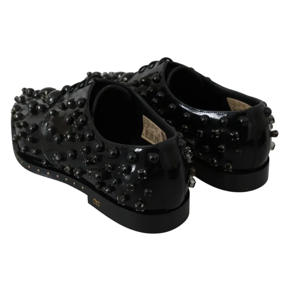 Forkæl dig selv med disse Dolce & Gabbana snøresko. Lavet i Italien af sort læder med indviklede sorte krystalpynt, disse kjolesko har de ikoniske logo detaljer. Et symbol på eksklusivitet og førsteklasses håndværk.