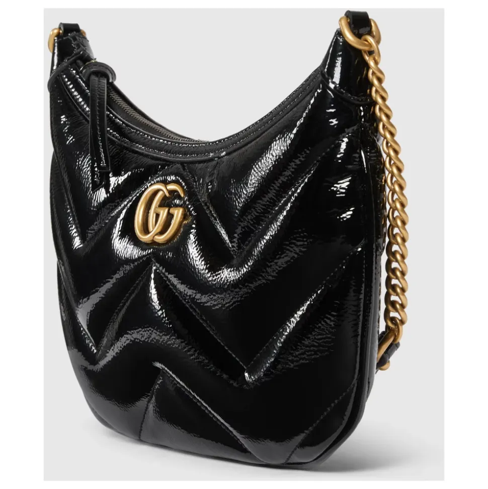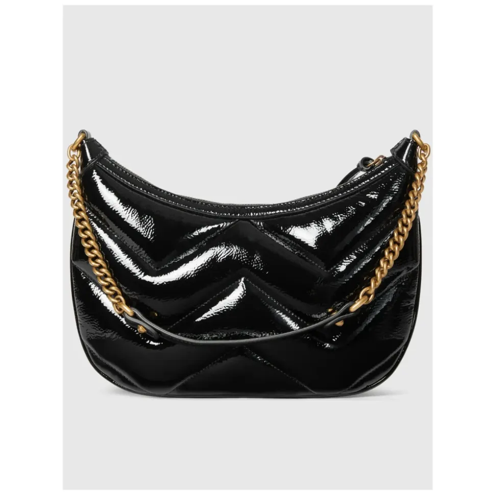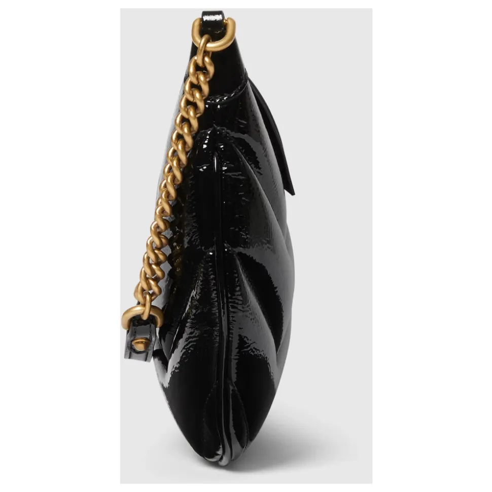 Forkæl dig selv med denne Gucci GG Marmont Small Shoulder Bag lavet i quiltet patentlæder med chevron mønster. Med lys guldtonet hardware, mikrofiberforing, dobbelt G detalje og lynlåslukning. Produceret i Italien. Mål: L 26 cm x H 17 cm x B 4 cm.