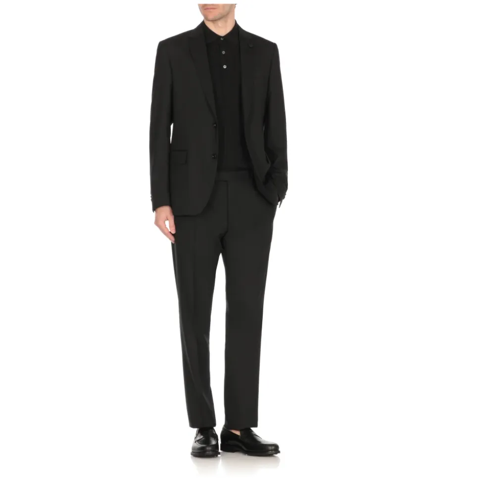 Forhøj din formelle look med dette sorte Lardini uldsæt til mænd. Jakken har en ikonisk nål, klassisk reverskrave og frontknapper. Jakken har en brystlomme, to forlommer og to bageste slidser i kanten. Bukserne har frontknapper og lynlåslukning, to sidelommer og to bageste knaplommer. Modellens højde er 190 cm, og han bruger størrelse 50.