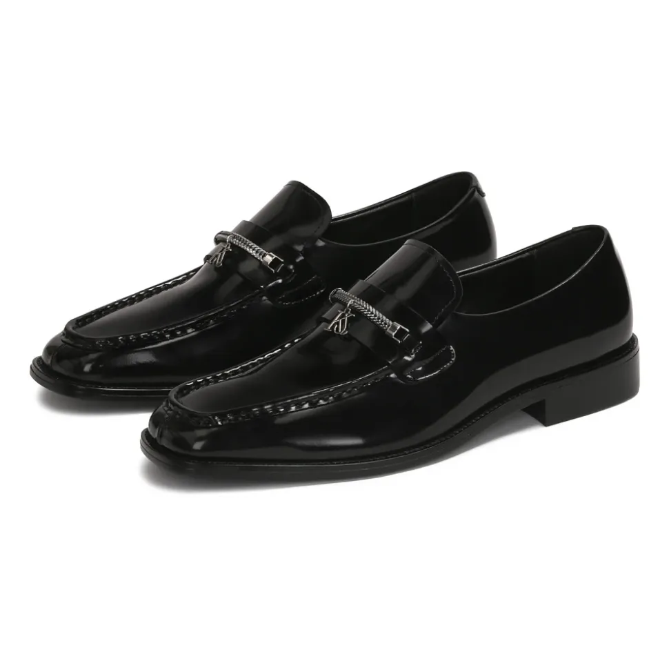 Sorte loafers lavet af høj kvalitet naturligt boks læder er definitionen på moderne elegance med et strejf af tidløs stil. Den subtile anilin finish giver skoene en delikat glans og glat tekstur, som perfekt harmonerer med det minimalistiske design. En sølvfarvet smykkeudsmykning på vristen fanger øjet og giver loafers en unik, let luksuriøs følelse. Det kraftige syning detalje på tåen tilføjer til deres særpræg og understreger det håndværksmæssige kvalitet af deres arbejde. Disse er sko, der vil fungere lige så godt til vigtige møder som til afslappede ture i byen. Stilfuldt sort, perfekt matchet til enhver outfit, gør dem til et alsidigt tilbehør, der vil finde sin vej med en velsyet dragt, såvel som med dine foretrukne chinos eller jeans. For dem, der fokuserer på mode uden at ofre komfort – dette er et must-have i skabet hos den moderne mand. Foret lavet af fint og blødt semianilin fåreskind giver den højeste grad af komfort. Lædersålen med gummisål kombinerer den elegante æstetik og naturlighed af læder med den enestående greb og holdbarhed af gummi, og tilbyder den perfekte kombination af komfort, sikkerhed og stil.