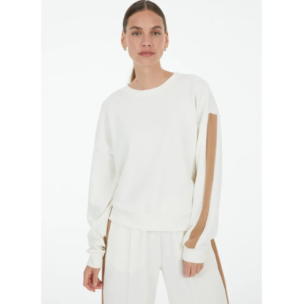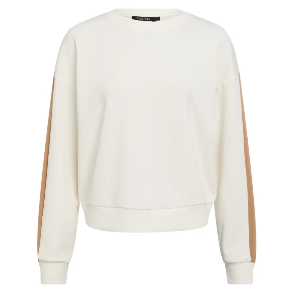 Marc Aurel sporty sweatshirt med stribeaccent kombinerer en blød modal-blanding med sandbrune ærmestriber og et diskret logo i nakken, designet til stilfuldt, afslappet hverdagsbrug. Vigtige egenskaber: Hvid | Balta | Modalblanding | Sporty silhuet | Sandbrune ærmestriber | Diskret logo i nakken | Sammensætning & pleje: Modalblanding