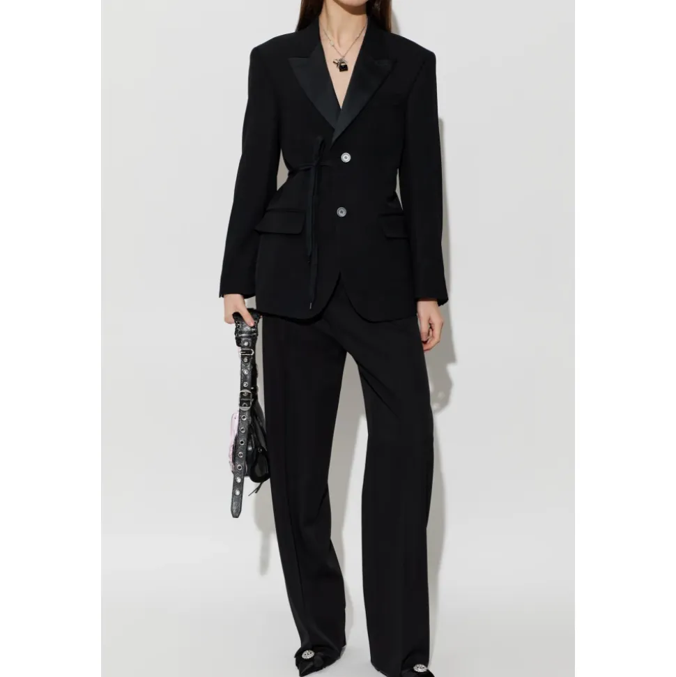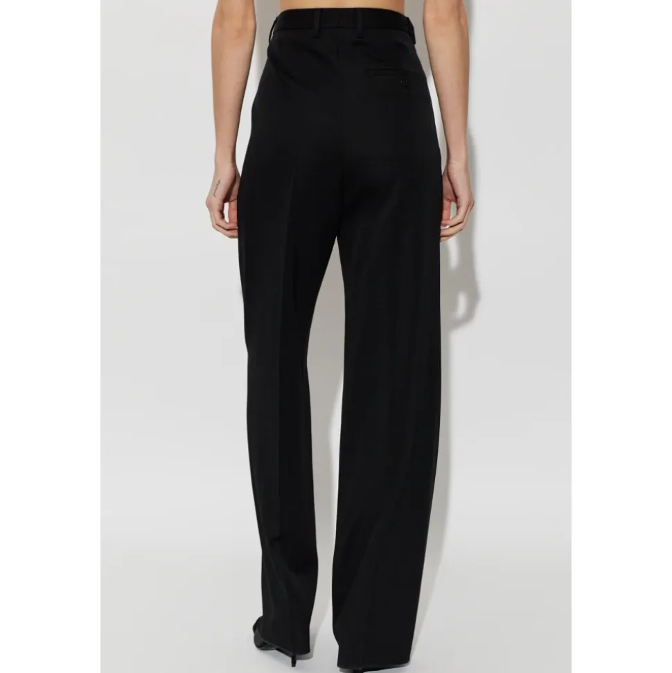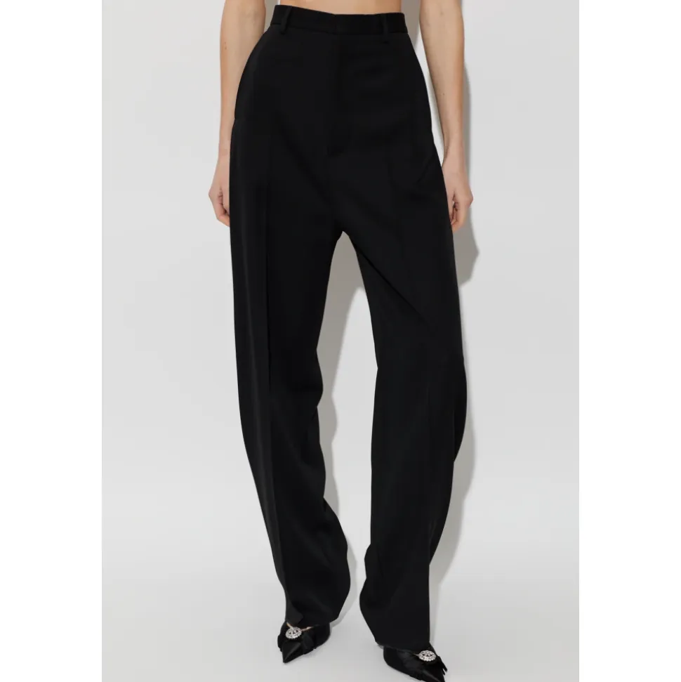 Balenciaga Store skræddersyede bukser er skræddersyede uldbukser, der kombinerer en afslappet, oversized silhuet med klassiske skræddersyede detaljer. De er fremstillet i barathea-uld og har pressede folder og et lige, bredt ben for et raffineret og alsidigt look. Nøgleattributter: Sort | Uld | Skjult lynlåsgylp med hægte- og knaplukning | 6 bæltestropper til justering af bælte | To skrålommer foran | En paspoleret baglomme med knap | Lige, bredt ben | Pressede folder | Paspoleret/welt baglomme med knap | Lang kant med let flare | Dimensioner og pasform: Modellens mål: Højde: 177 cm, Bryst: 83 cm, Talje: 61 cm, Hofter: 89 cm | Modellen er iført størrelse: 36 | Stor pasform | Sammensætning og pleje: Hovedmateriale: 100% uld | Lomme foring: 100% bomuld | Må ikke vaskes. Må ikke bleges. Må ikke tørretumbles. Stryg ved maksimal temperatur 120°C. Kemisk rensning med tetrachlorethen eller kulbrinter – mild proces.