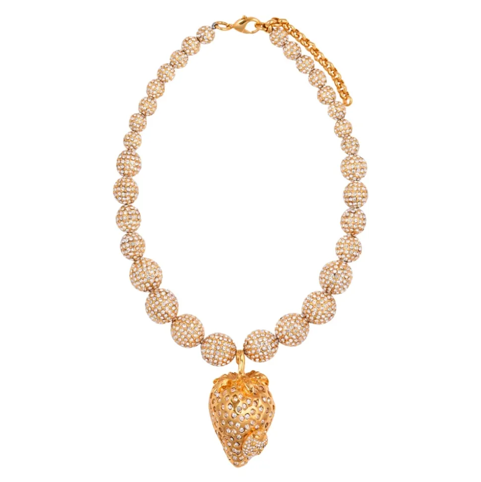 Balmain Strawberry halskæden med metal og rhinsten er et iøjnefaldende tilbehør med et unikt jordbær- og mariehønevedhæng. Denne guldfarvede halskæde er fremstillet i Italien og er besat med glitrende rhinsten og viser Balmain Paris-logoet indgraveret på bagsiden. Produkt detaljer: Guld | Gul | 100% Zamak | Justerbar med led | Fjederlås | Jordbær- og mariehønevedhæng | Metallisk perlehalskæde | Sammensætning og pleje: 100% Zamak