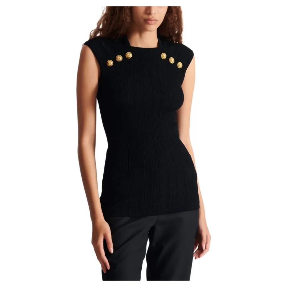 Balmain Striktrøje med 6 knapper er en figursyet striktrøje med rund hals, fremhævet med seks guldfarvede ‘Coin’-knapper for et poleret, elegant og afslappet look. Ideel til lag-på-lag eller sammen med skræddersyede underdele. Vigtige egenskaber: Sort | Viskose | Rund hals | 6 dekorative ‘Coin’ guldfarvede metalknapper foran | Rundhalset strik | Mål og pasform: Modellen er 180 cm høj og bærer en størrelse 36 | Figursyet | Sammensætning og pleje: 83% viskose, 17% polyester