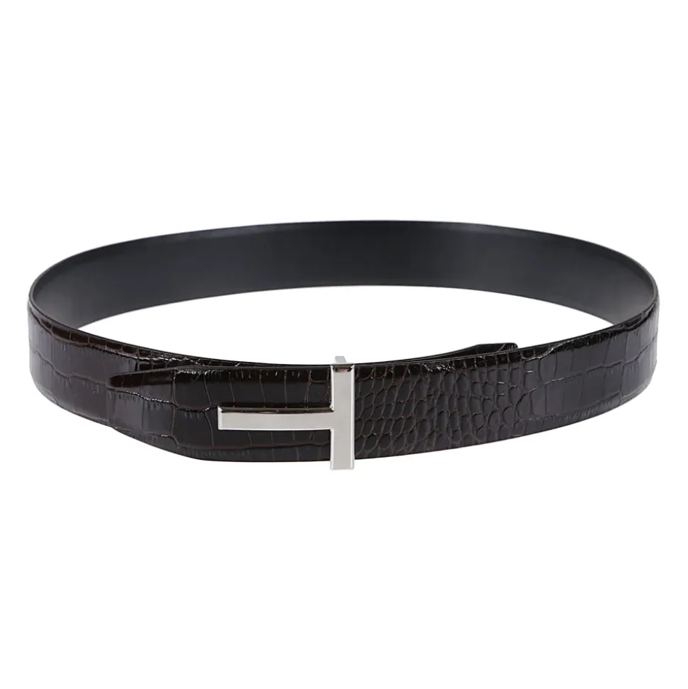 Tom Ford T Buckle Reversible Belt kombinerer labelens signatur T-logo spænde med en vendbar læderrem, hvilket giver et alsidigt finish til både formelle og smarte casual looks. Nøgleattributter: Brun | Espresso | Læder | Vendbart design | Justerbar stiftlukning | Spændelukning | T-logo spænde | Grainet læder finish | Dimensioner og pasform: Bredde: 4 cm | Justerbar pasform | Sammensætning og pleje: 100% Kalvelæder | Hardware: Messing (palladium galvanisering)