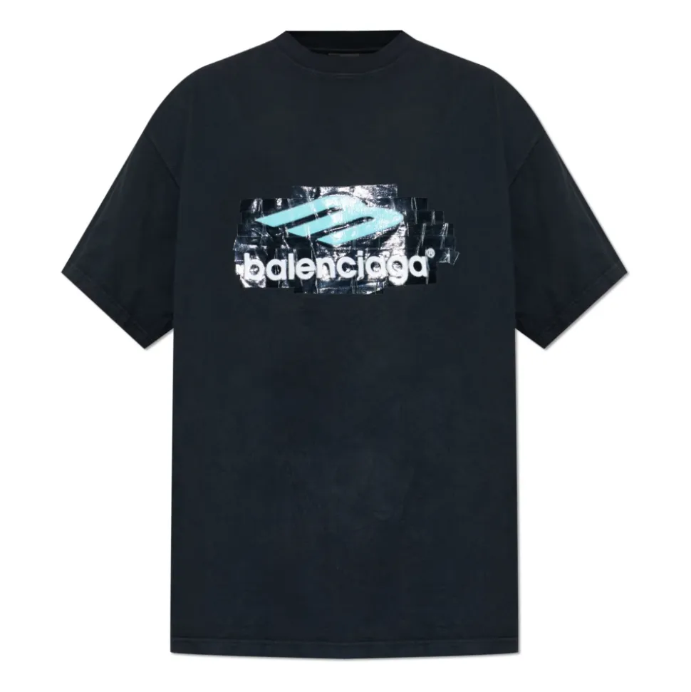 Balenciaga T-shirt med et tape-effekt print på brystet, der viser en lyseblå grafik og den hvide “BALENCIAGA” inskription på en sort baggrund. Det klassiske, let oversized snit og den runde halsudskæring giver en afslappet silhuet med blød, åndbar bomuldskomfort. Vigtigste egenskaber: Sort | Bomuld | Åndbart stof | Blød overflade | Rund halsudskæring | Korte ærmer | Centreret print på brystet | Tape-effekt grafik | BALENCIAGA logo | Dimensioner og pasform: Let oversized pasform | Sammensætning og pleje: 100% bomuld