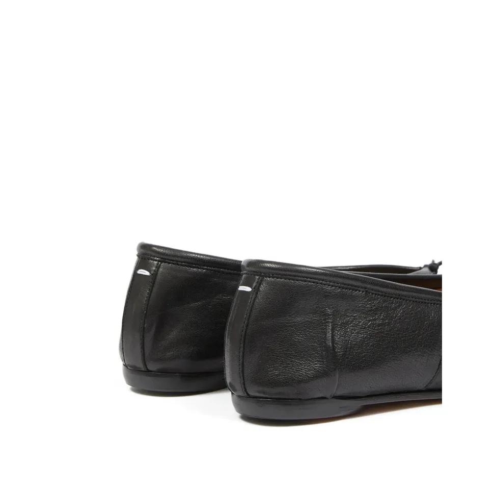 Maison Margiela Tabi Ballerina, der kombinerer mærkets ikoniske split-toe silhuet med en lav, flad profil og knudedetalje – designet til et poleret hverdagslook. Vigtigste egenskaber: Sort | Lammeskind | Slip-on model | Flad sål | Tabi split-toe | Knudedetalje | Signatur enkelt-sting logo ved hælen | Flad lædersål | Sammensætning og pleje: Ydre: Lammeskind 100% | For: Kalvelæder 100% | Sål: Kalvelæder 100%