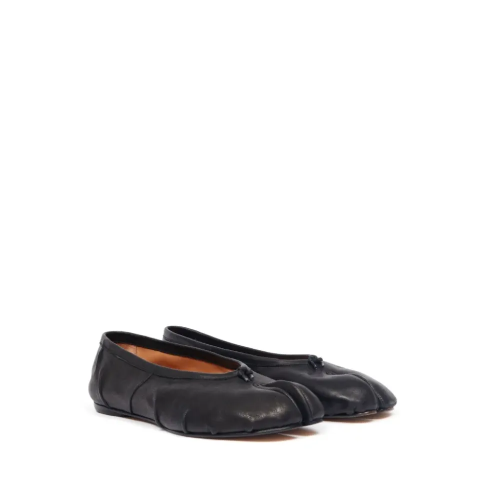 Maison Margiela Tabi New Ballerina (Varekode S58WZ0127P6378T8013) fortolker arkivalske ballerina sko med husets signatur split-tå. Designet fremhæver den karakteristiske Tabi split og hvide stikningsdetalje for en øjeblikkeligt genkendelig finish. Vigtige egenskaber: Sort | Bovineskind læder | Kalveskindsfor | Kalveskindssål | Lille hæl | Tabi split-tå | Hvid stikningsdetalje bagpå | Bomuldsknude på tå | Håndlavede læderfolder | Slidt/vintage behandling | Sammensætning & pleje: Bovineskind | Kalveskindsfor | Kalveskindssål | På grund af nappalæderets fine karakter, brug vegetabilske læderplejeprodukter til vedligeholdelse.