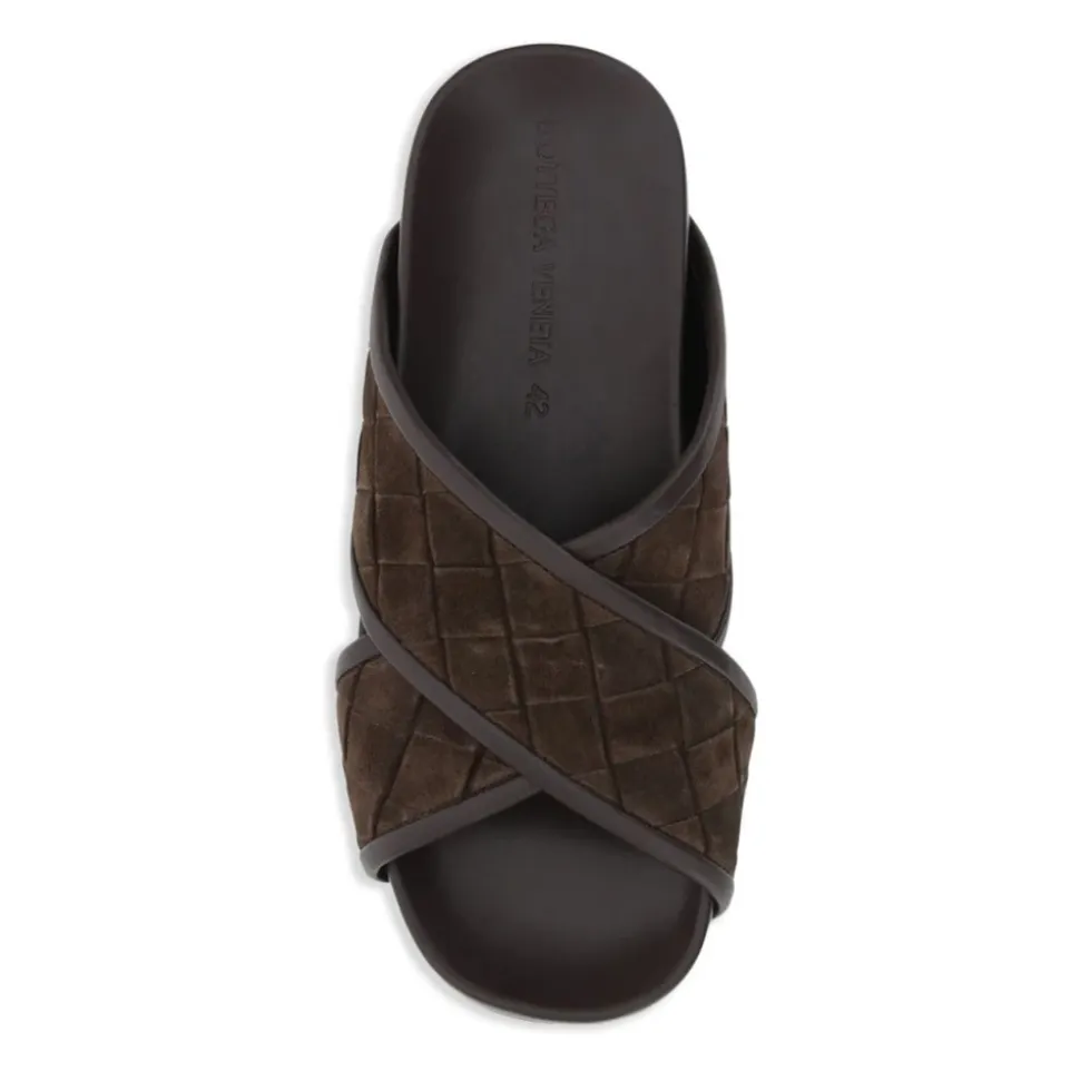 Bottega Veneta Tarik Sandal – en lædersandal skabt til komfort og hverdagsbrug i varmt vejr. Designet kombinerer en overdel i kalvelæder med en ydersål i gummi for en slidstærk og let slip-on mulighed. Nøgleattributter: Brun | Kalvelæder | Slidstærk | Komfortabel | Slip-on konstruktion | Støbt fodseng | Ydersål i gummi | Krydsrem | Åben rund tå | Intrecciato detalje | Dimensioner og pasform: Hælhøjde: 3,0 cm | Sålhøjde: 2,5 cm | Sammensætning og pleje: Overdel: 100% kalvelæder | Sål: 100% gummi