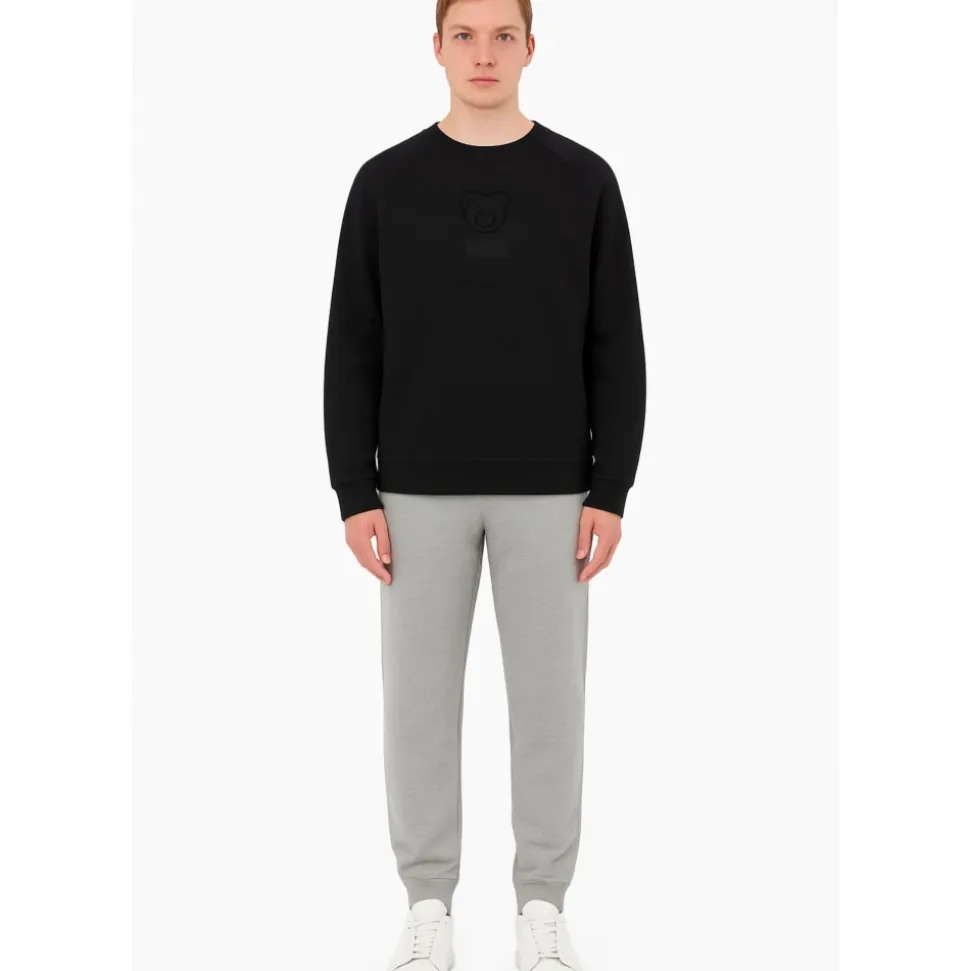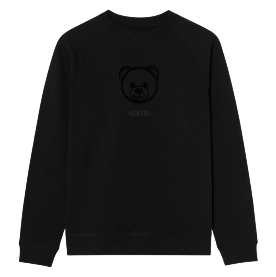 Moschino Teddy Bear Sweatshirt er en afslappet luksus-crewneck, der er fremstillet af blød bomuld og afsluttet med brandets tone-i-tone bjørnelogo på brystet. Den er designet til hverdagsbrug og streetwear-styling. Vigtige egenskaber: Sort | Bomuld | Crewneck | Lange ærmer | Tone-i-tone Moschino bjørnelogoprint på brystet | Ribstrikkede manchetter og søm med elastisk kant | Dimensioner og pasform: Regular fit | Sammensætning og pleje: 100% bomuld