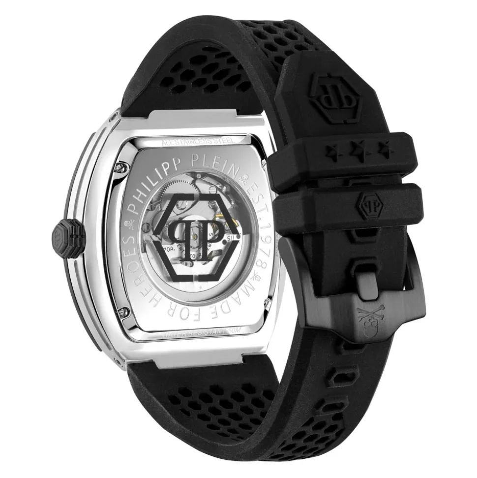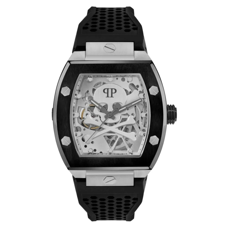 Philipp Plein The $keleton er et automatisk ur, der kombinerer en markant sort rustfri stålkasse med en silikonerem for et slående hverdags- og aftenlook. Det robuste mineralglas og 5 bars vandtæthed gør det velegnet til aktiv brug, samtidig med at det bevarer et raffineret udseende. Vigtige egenskaber: Sort | Schwarz | Edelstahl | Vandtæthed op til 5 bar | Automatisk urværk | Mineralglas | Silikone/gummi rem | Skeletdesign | Markant sort kasse | Distinkt statement-look | Sammensætning & pleje: Edelstahl | Mineralglas | Silikon/Gummi