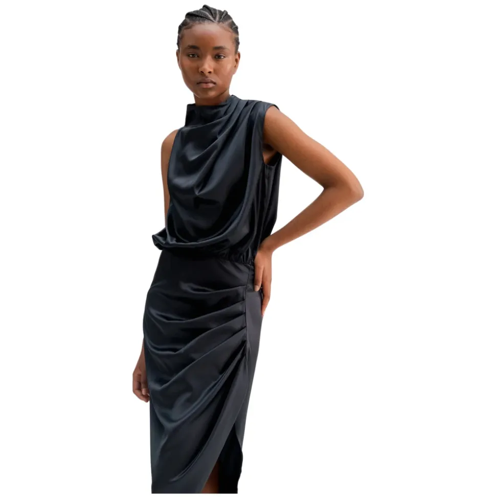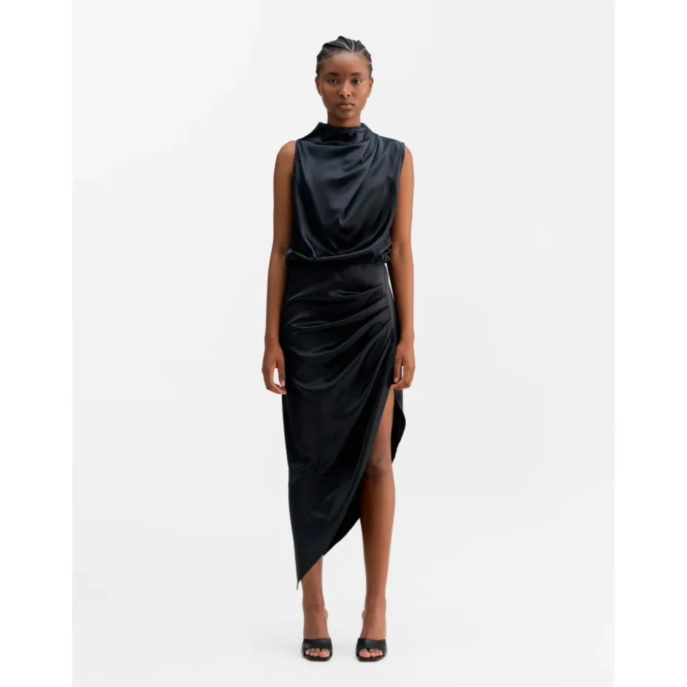 Tilda-kjolen er skåret i en blanding af acetat/stretch med en satinoverflade. Den har asymmetriske folder til drapering langs halsudskæringen og en skjult lynlås i nakken bagpå. Nederdelen har en høj slidse og er placeret med folder til drapering, og der er elastik omkring taljen. Den perfekte kjole til sene fester. • Pasform: Normal i størrelsen, tag din standardstørrelse. Modellen er 172 cm høj og bruger størrelse small. • Kvalitet: 65% acetat, 31% polyester, 4% spandex • Vedligeholdelsesinstruktioner: Håndvask. Må ikke tørretumbles. Stryges ved svag varme.