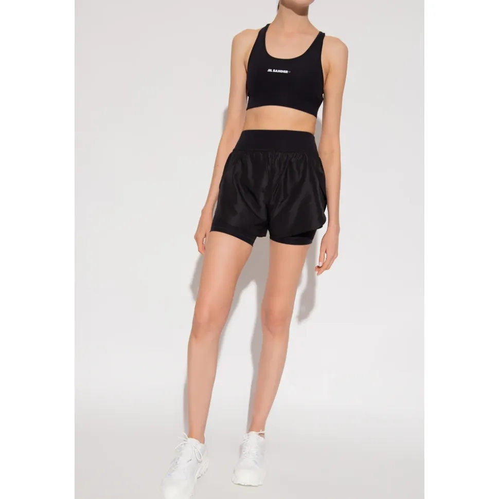 Oplev den ultimative komfort og stil med Jil Sanders sorte, tolags træningsshorts. Perfekte til fitnessentusiaster, disse shorts har en elastisk linning og et elegant hvidt logoprint. Produkt detaljer: Sort | Elastisk linning | Tolags design | Hvidt logoprint | Dimensioner og pasform: Modellen er iført størrelse XS |