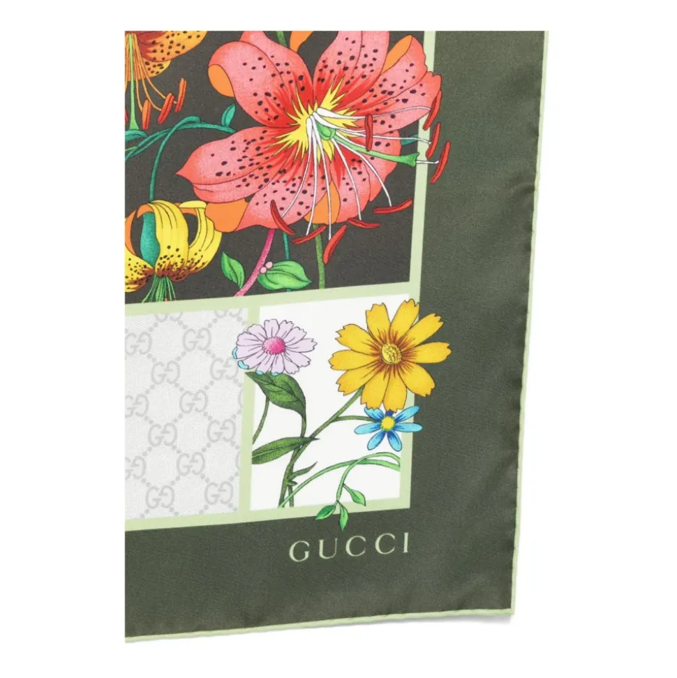 Gucci trykt silketørklæde er et let silketørklæde med tryk, der tilføjer raffineret farve og mønster til outfits. Alsidigt til styling omkring halsen, som et hovedtørklæde eller som tilbehør på tasker. Vigtige egenskaber: Flerfarvet | Grøn | Silke | Trykt mønster | Foulard-stil | Silkeagtig finish | Sammensætning & pleje: Silke