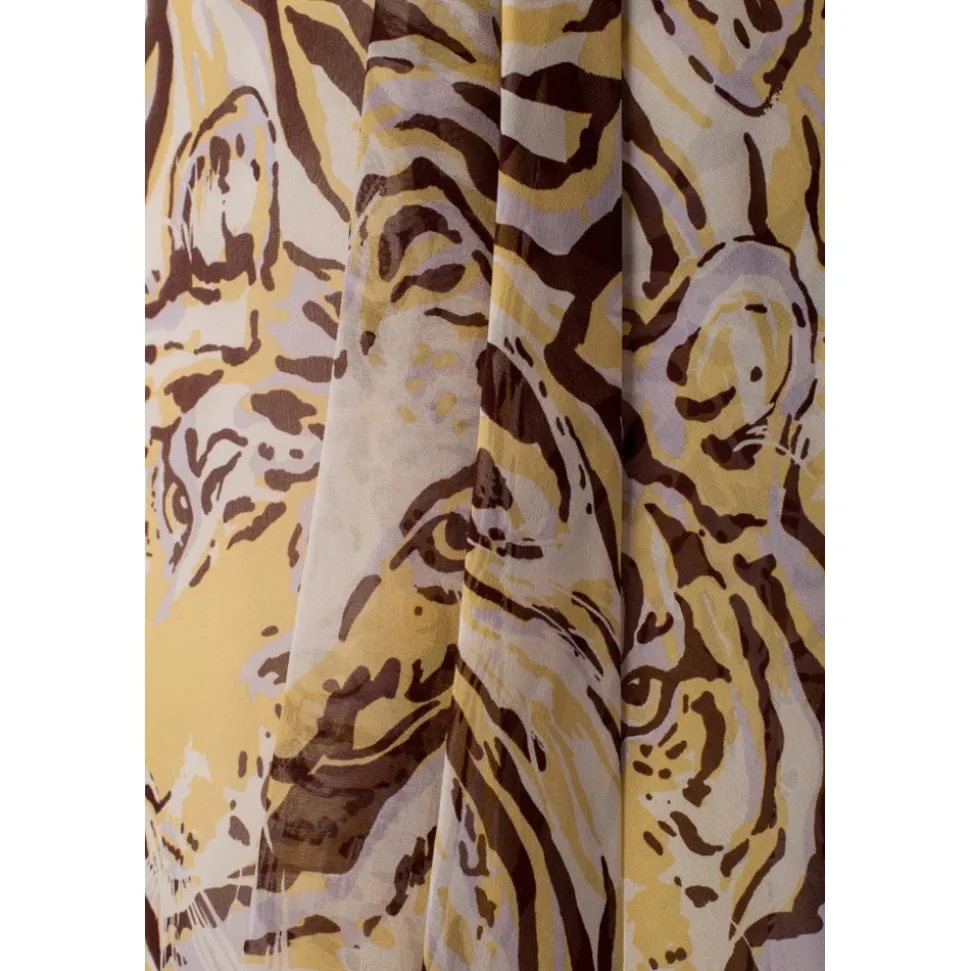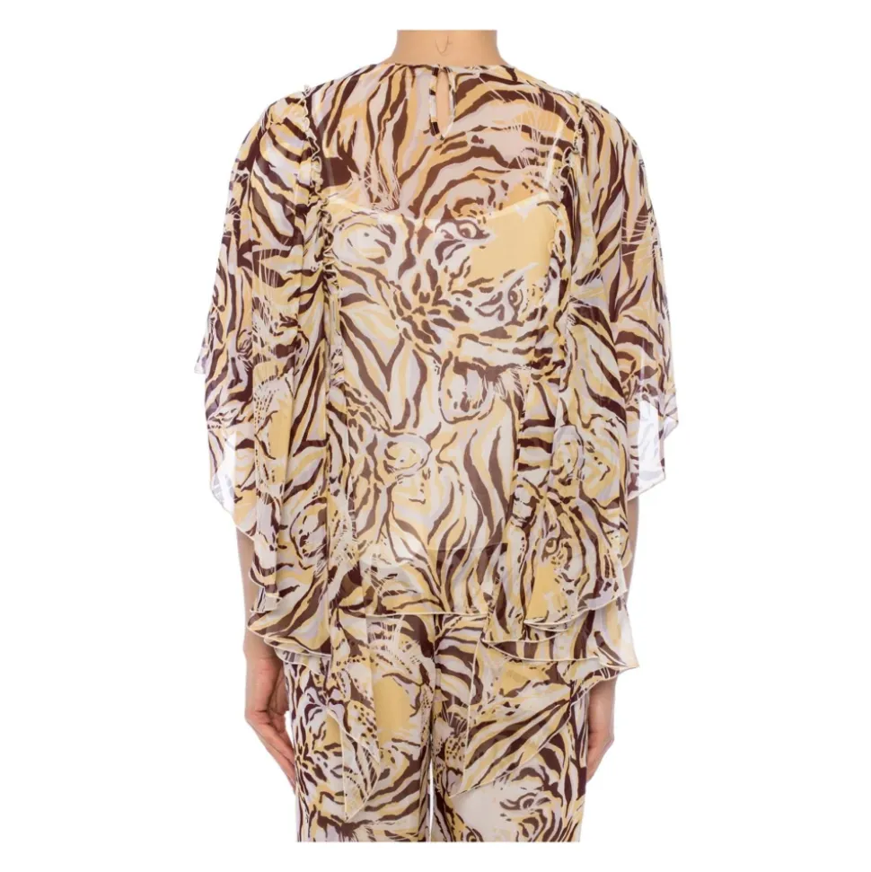 Gennemsigtig top i gul, brun og lyserød fra See By Chloé. Dekoreret med rynker og et trykt tigerhovedmotiv. Rund halsudskæring.